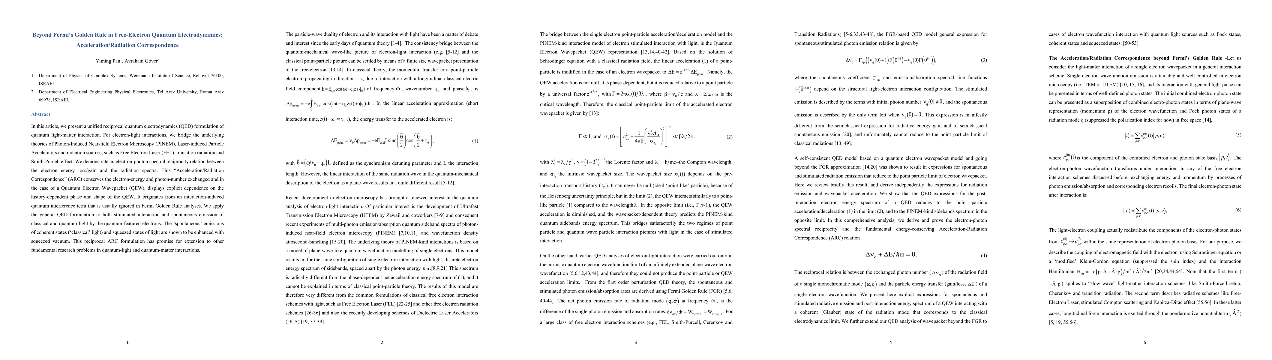 This paper presents a unified quantum electrodynamics (QED) framework for electron-light interactions, introducing an "Acceleration/Radiation Correspondence" that bridges theories of PINEM, laser accelerators, and FELs. It reveals an electron-photon reciprocity relation conserving energy and photon number, highlighting the role of quantum interference beyond Fermi's Golden Rule.