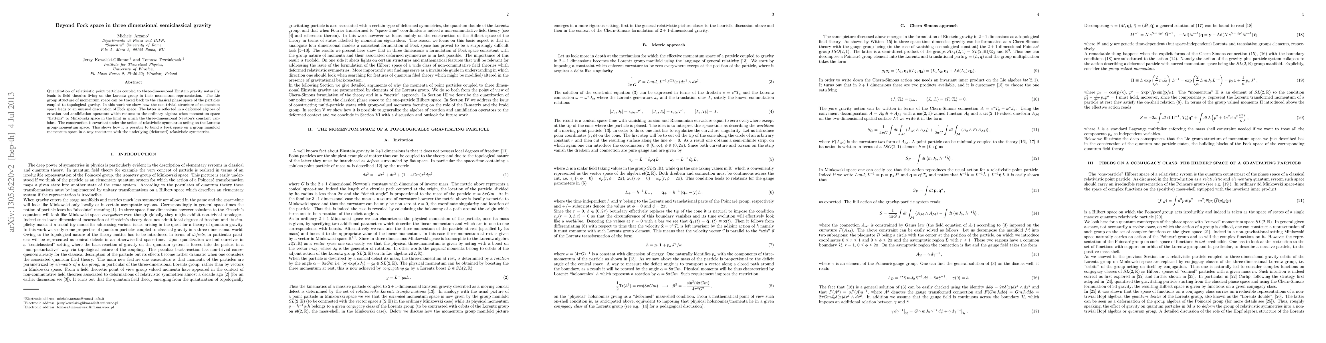 This paper explores the quantization of relativistic point particles in three-dimensional semiclassical gravity, revealing a deformed algebra of creation and annihilation operators that describes an unusual Fock space structure. The construction is covariant under relativistic symmetries and reduces to ordinary Fock space when the three-dimensional Newton's constant approaches zero.