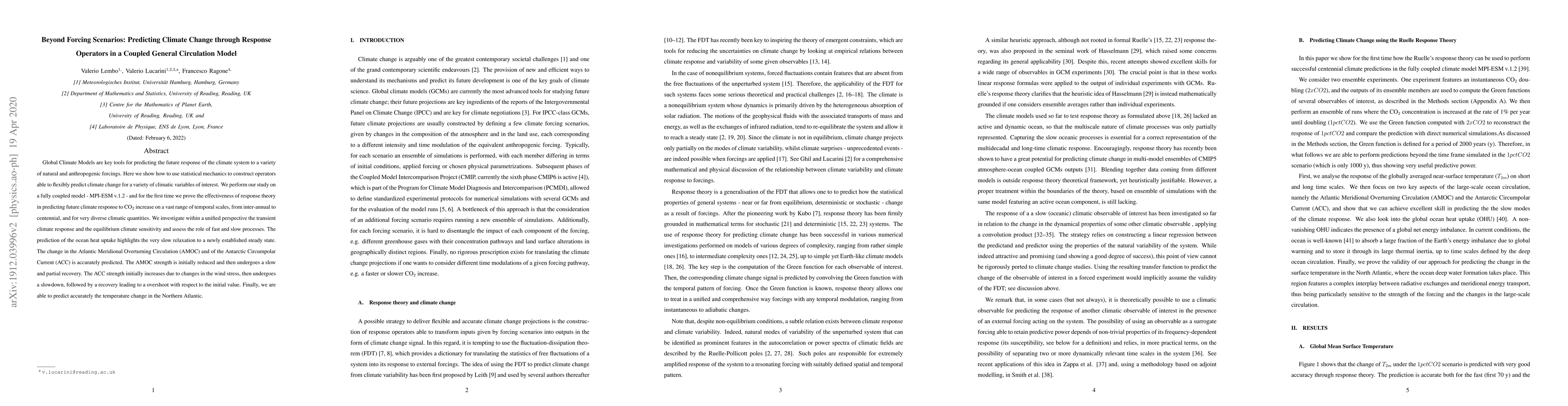 This paper demonstrates the use of statistical mechanics to construct operators in a coupled general circulation model (MPI-ESM v.1.2) for predicting climate change responses to CO$_2$ increase across various temporal scales. It successfully predicts changes in ocean currents and temperature in the Northern Atlantic, highlighting the slow recovery and overshoot dynamics of the Atlantic Meridional Overturning Circulation and Antarctic Circumpolar Current.