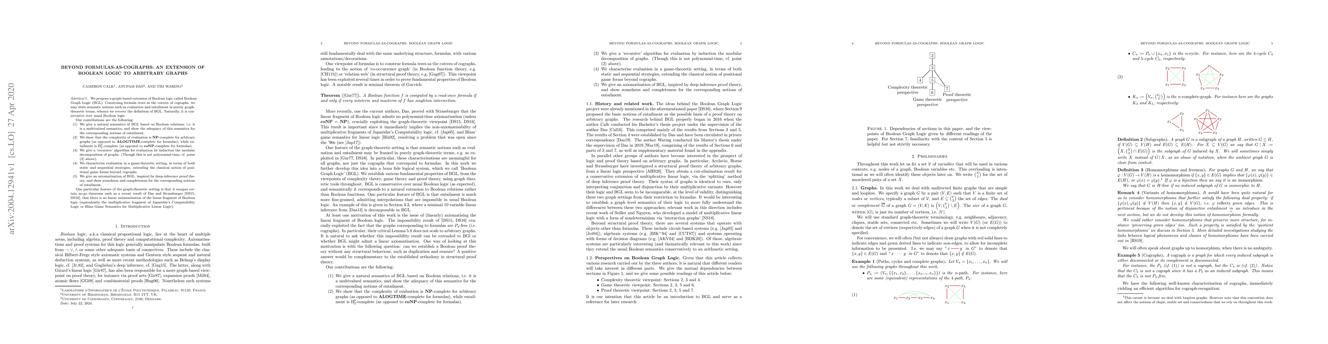 We propose a graph-based extension of Boolean logic called Boolean Graph Logic (BGL). Construing formula trees as the cotrees of cographs, we may state semantic notions such as evaluation and entailment in purely graph-theoretic terms, whence we recover the definition of BGL. Naturally, it is conservative over usual Boolean logic. Our contributions are the following: (1) We give a natural semantics of BGL based on Boolean relations, i.e. it is a multivalued semantics, and show adequacy of this semantics for the corresponding notions of entailment. (2) We show that the complexity of evaluation is NP-complete for arbitrary graphs (as opposed to ALOGTIME-complete for formulas), while entailment is $\Pi^p_2$-complete (as opposed to coNP-complete for formulas). (3) We give a 'recursive' algorithm for evaluation by induction on the modular decomposition of graphs. (Though this is not polynomial-time, cf. point (2) above). (4) We characterise evaluation in a game-theoretic setting, in terms of both static and sequentical strategies, extending the classical notion of positional game forms beyond cographs. (5) We give an axiomatisation of BGL, inspired by deep-inference proof theory, and show soundness and completeness for the corresponding notions of entailment. One particular feature of the graph-theoretic setting is that it escapes certain no-go theorems such as a recent result of Das and Strassburger, that there is no linear axiomatisation of the linear fragment of Boolean logic (equivalently the multiplicative fragment of Japaridze's Computability Logic or Blass' game semantics for Mutliplicative Linear Logic).