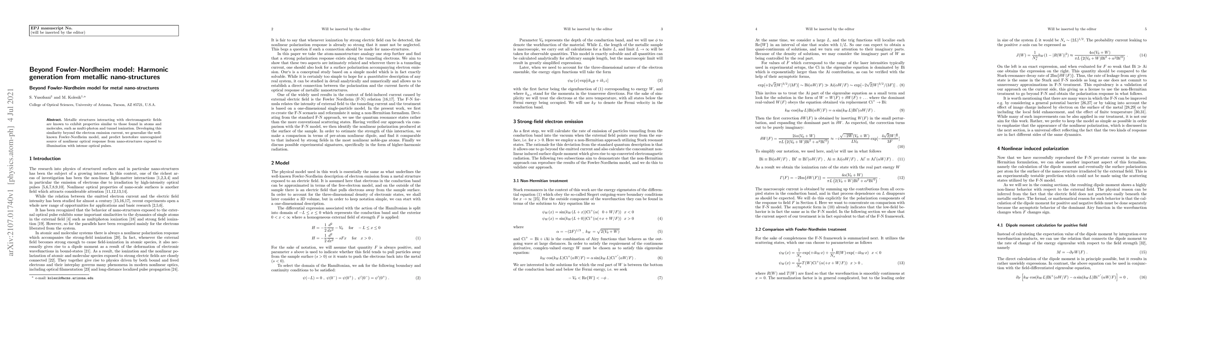 This paper generalizes the Fowler-Nordheim model to predict a new source of nonlinear optical response from metallic nano-structures under intense optical pulses, extending beyond traditional electron emission current. The findings reveal harmonic generation in these structures, akin to multi-photon and tunnel ionization processes in atoms and molecules.