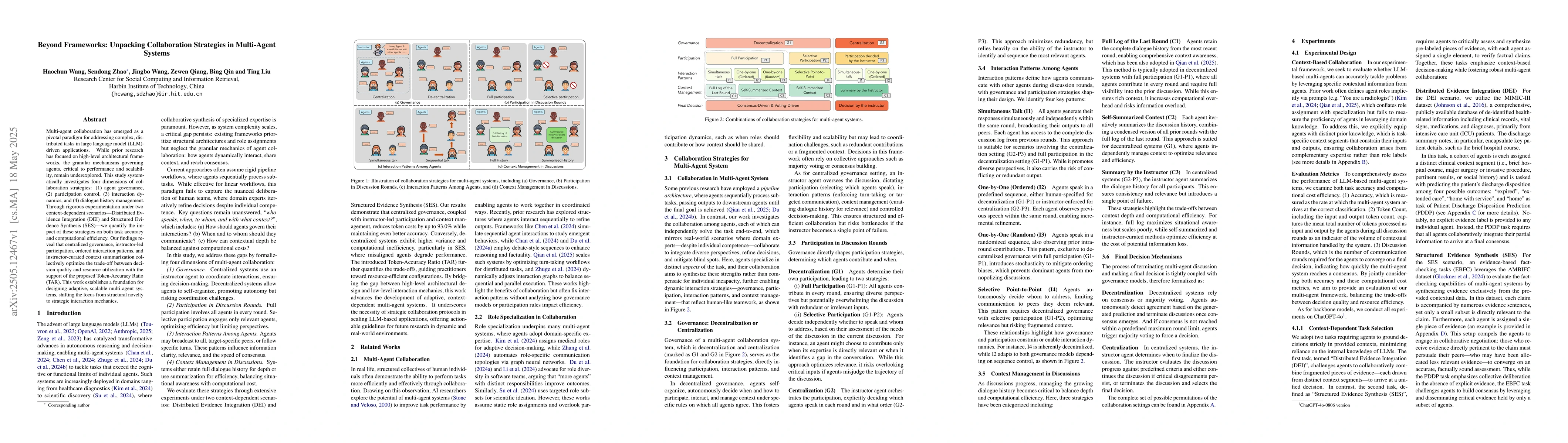 The study systematically investigates four dimensions of collaboration strategies: agent governance, participation control, interaction dynamics, and dialogue history management. Rigorous experimentation was conducted under two scenarios: Distributed Evidence Integration (DEI) and Structured Evidence Synthesis (SES).