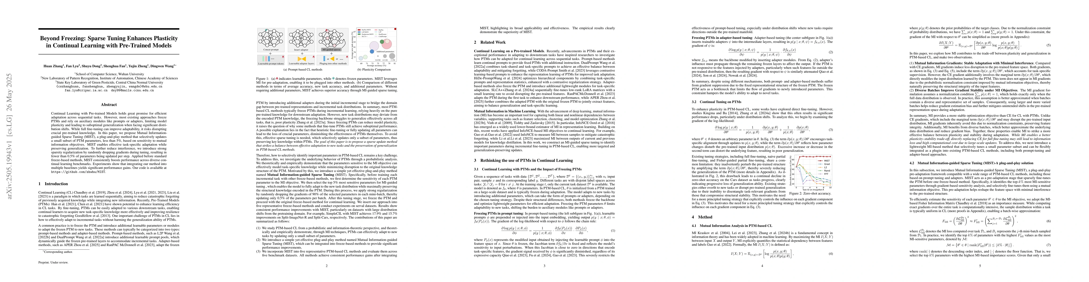 A new method called Mutual Information-guided Sparse Tuning (MIST) enhances plasticity in continual learning with pre-trained models by selectively updating a small subset of parameters based on mutual information objectives, achieving significant performance gains over existing approaches.