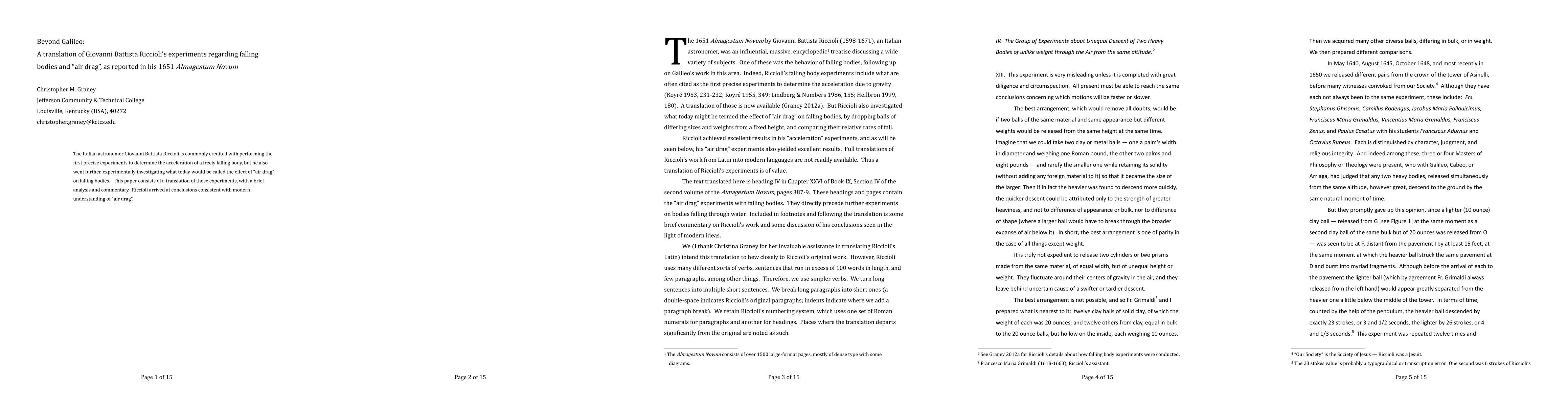 Summary: This paper translates and analyzes Giovanni Battista Riccioli's 1651 experiments on the acceleration of falling bodies and the effect of air drag, revealing that he reached conclusions consistent with modern understanding of air resistance. Riccioli's work extends beyond Galileo's foundational studies.