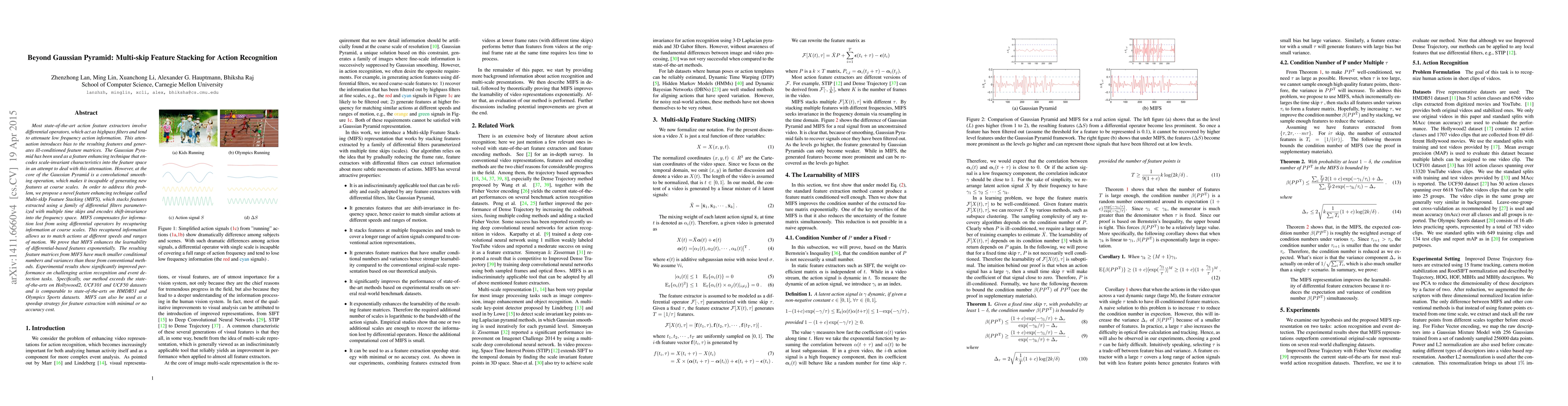 Most state-of-the-art action feature extractors involve differential operators, which act as highpass filters and tend to attenuate low frequency action information. This attenuation introduces bias to the resulting features and generates ill-conditioned feature matrices. The Gaussian Pyramid has been used as a feature enhancing technique that encodes scale-invariant characteristics into the feature space in an attempt to deal with this attenuation. However, at the core of the Gaussian Pyramid is a convolutional smoothing operation, which makes it incapable of generating new features at coarse scales. In order to address this problem, we propose a novel feature enhancing technique called Multi-skIp Feature Stacking (MIFS), which stacks features extracted using a family of differential filters parameterized with multiple time skips and encodes shift-invariance into the frequency space. MIFS compensates for information lost from using differential operators by recapturing information at coarse scales. This recaptured information allows us to match actions at different speeds and ranges of motion. We prove that MIFS enhances the learnability of differential-based features exponentially. The resulting feature matrices from MIFS have much smaller conditional numbers and variances than those from conventional methods. Experimental results show significantly improved performance on challenging action recognition and event detection tasks. Specifically, our method exceeds the state-of-the-arts on Hollywood2, UCF101 and UCF50 datasets and is comparable to state-of-the-arts on HMDB51 and Olympics Sports datasets. MIFS can also be used as a speedup strategy for feature extraction with minimal or no accuracy cost.