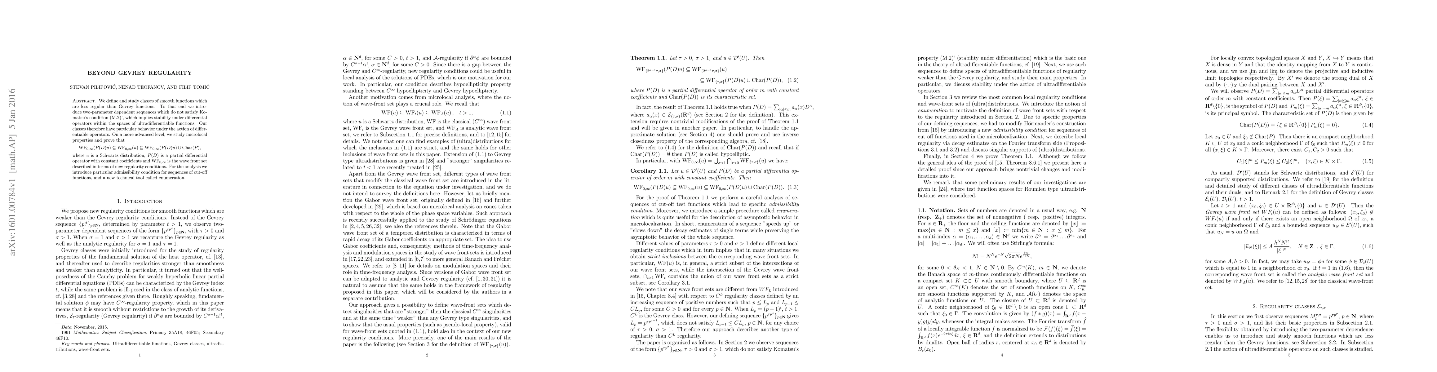 We define and study classes of smooth functions which are less regular than Gevrey functions. To that end we introduce two-parameter dependent sequences which do not satisfy Komatsu's condition (M.2)', which implies stability under differential operators within the spaces of ultradifferentiable functions. Our classes therefore have particular behavior under the action of differentiable operators. On a more advanced level, we study microlocal properties and prove that $${\rm WF}_{0,\infty}(P(D)u)\subseteq {\rm WF}_{0,\infty}(u)\subseteq {\rm WF}_{0,\infty}(P(D)u) \cup {\rm Char}(P),$$ where $u$ is a Schwartz distribution, $P(D)$ is a partial differential operator with constant coefficients and ${\rm WF}_{0,\infty}$ is the wave front set described in terms of new regularity conditions. For the analysis we introduce particular admissibility condition for sequences of cut-off functions, and a new technical tool called enumeration.