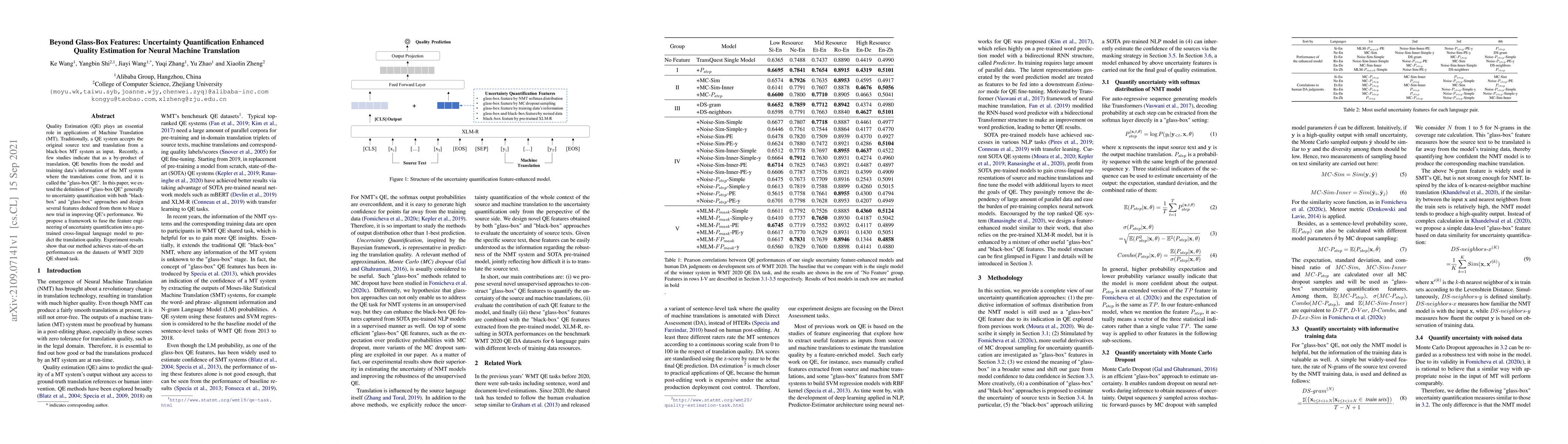 This paper proposes a framework that enhances Quality Estimation (QE) for Neural Machine Translation (NMT) by integrating uncertainty quantification features from both "black-box" and "glass-box" approaches. The results demonstrate state-of-the-art performance on WMT 2020 QE shared task datasets.