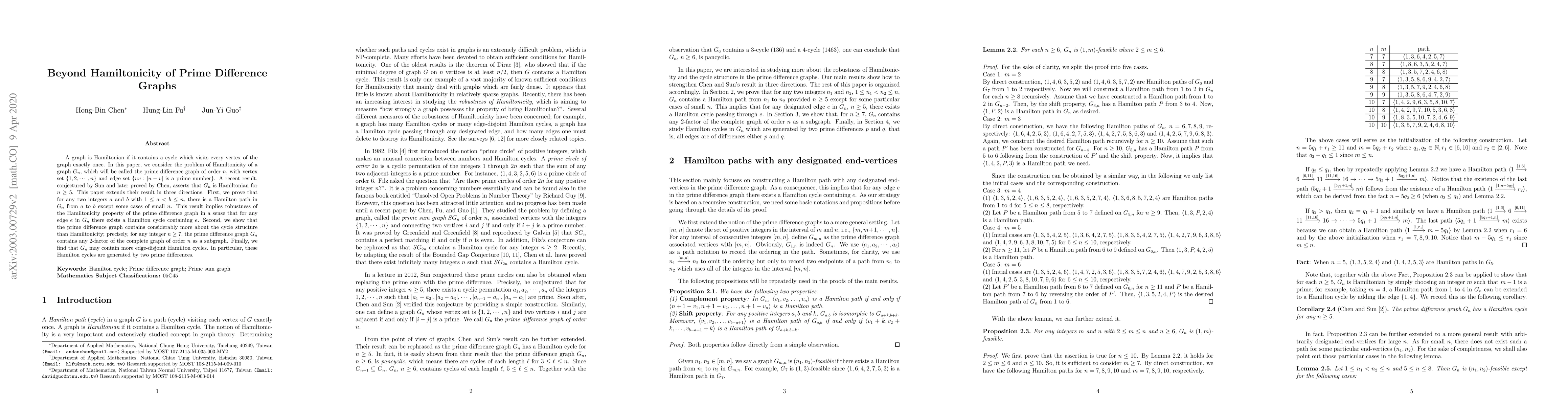 This paper investigates the Hamiltonicity of prime difference graphs $G_n$ and extends previous results by proving the existence of Hamilton paths between any two vertices, the inclusion of any 2-factor of $K_n$ as a subgraph for $n\geq 7$, and the potential for multiple edge-disjoint Hamilton cycles generated by two prime differences.