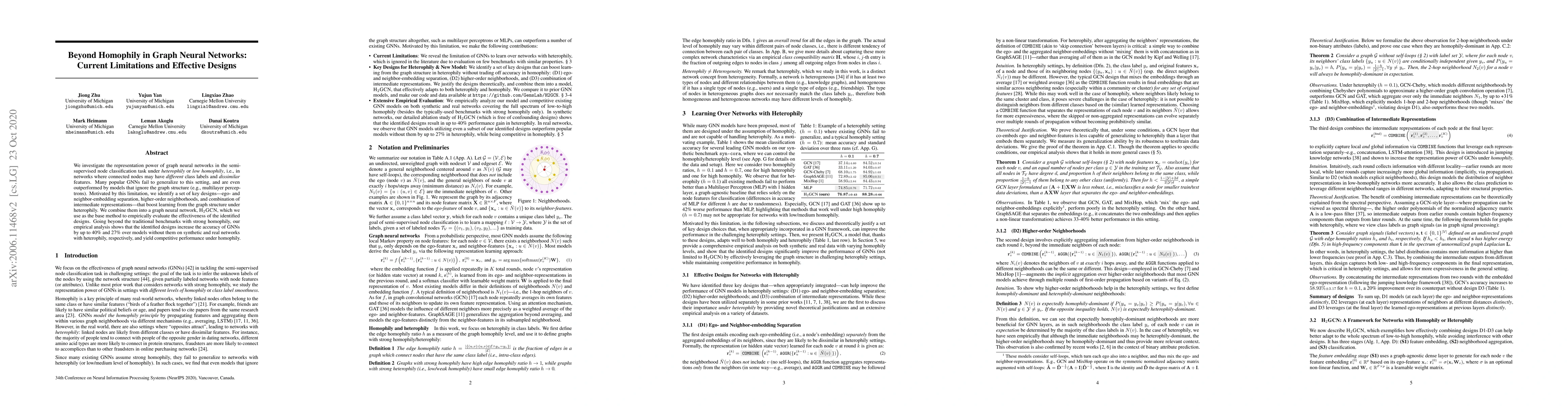 We investigate the representation power of graph neural networks in the semi-supervised node classification task under heterophily or low homophily, i.e., in networks where connected nodes may have different class labels and dissimilar features. Many popular GNNs fail to generalize to this setting, and are even outperformed by models that ignore the graph structure (e.g., multilayer perceptrons). Motivated by this limitation, we identify a set of key designs -- ego- and neighbor-embedding separation, higher-order neighborhoods, and combination of intermediate representations -- that boost learning from the graph structure under heterophily. We combine them into a graph neural network, H2GCN, which we use as the base method to empirically evaluate the effectiveness of the identified designs. Going beyond the traditional benchmarks with strong homophily, our empirical analysis shows that the identified designs increase the accuracy of GNNs by up to 40% and 27% over models without them on synthetic and real networks with heterophily, respectively, and yield competitive performance under homophily.