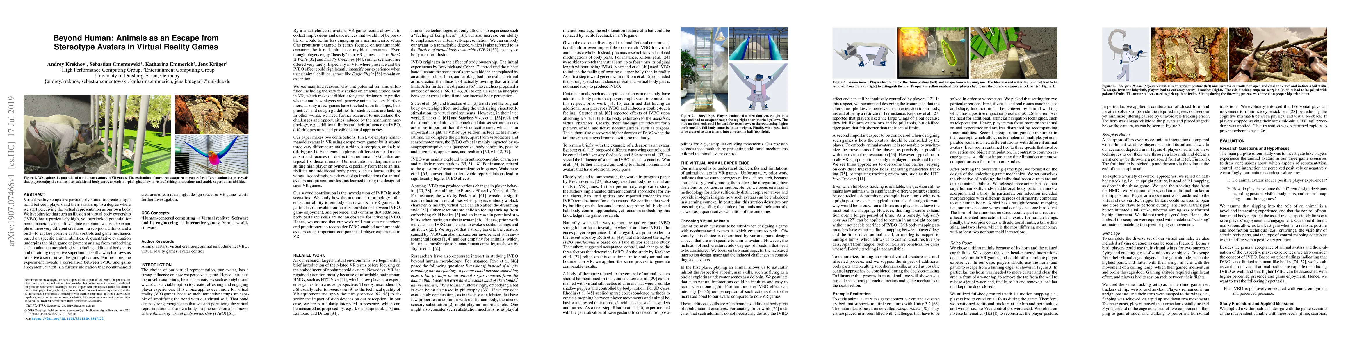 This study explores the potential of nonhumanoid avatars in virtual reality games, demonstrating that embodying creatures like a scorpion, rhino, or bird can enhance game enjoyment and create a strong illusion of virtual body ownership. The findings suggest that nonhuman avatars provide a valuable design space for VR gaming.