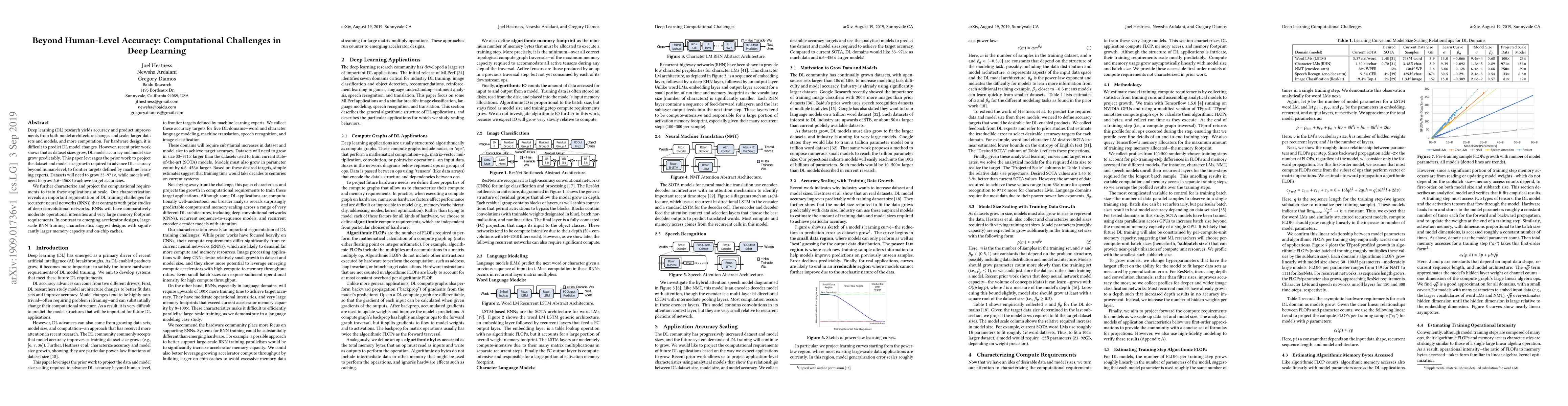 This paper projects the necessary growth of datasets and model sizes to achieve deep learning accuracies beyond human-level, revealing that datasets must increase by 33-971 times and models by 6.6-456 times. It also highlights the distinct computational challenges for training recurrent neural networks compared to deep convolutional networks, emphasizing the need for larger memory capacity and on-chip caches in hardware design.