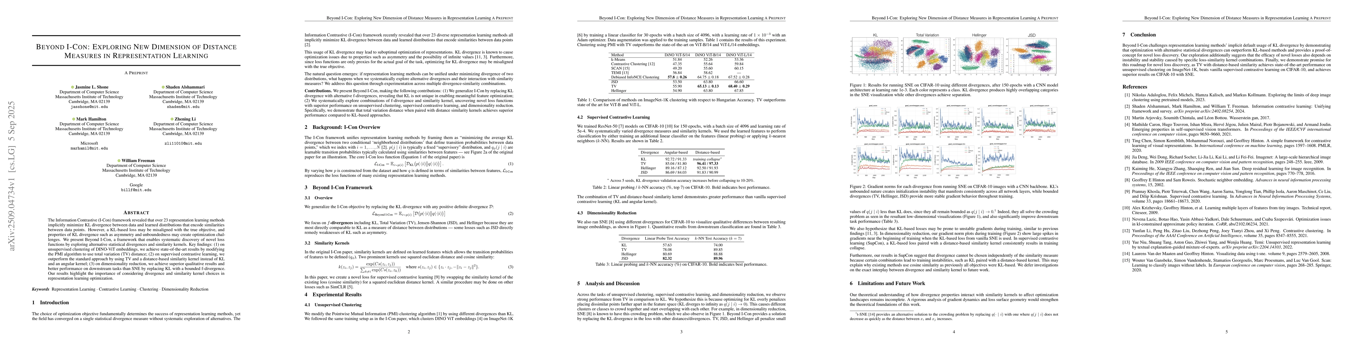 The Information Contrastive (I-Con) framework revealed that over 23 representation learning methods implicitly minimize KL divergence between data and learned distributions that encode similarities between data points. However, a KL-based loss may be misaligned with the true objective, and properties of KL divergence such as asymmetry and unboundedness may create optimization challenges. We present Beyond I-Con, a framework that enables systematic discovery of novel loss functions by exploring alternative statistical divergences and similarity kernels. Key findings: (1) on unsupervised clustering of DINO-ViT embeddings, we achieve state-of-the-art results by modifying the PMI algorithm to use total variation (TV) distance; (2) on supervised contrastive learning, we outperform the standard approach by using TV and a distance-based similarity kernel instead of KL and an angular kernel; (3) on dimensionality reduction, we achieve superior qualitative results and better performance on downstream tasks than SNE by replacing KL with a bounded f-divergence. Our results highlight the importance of considering divergence and similarity kernel choices in representation learning optimization.