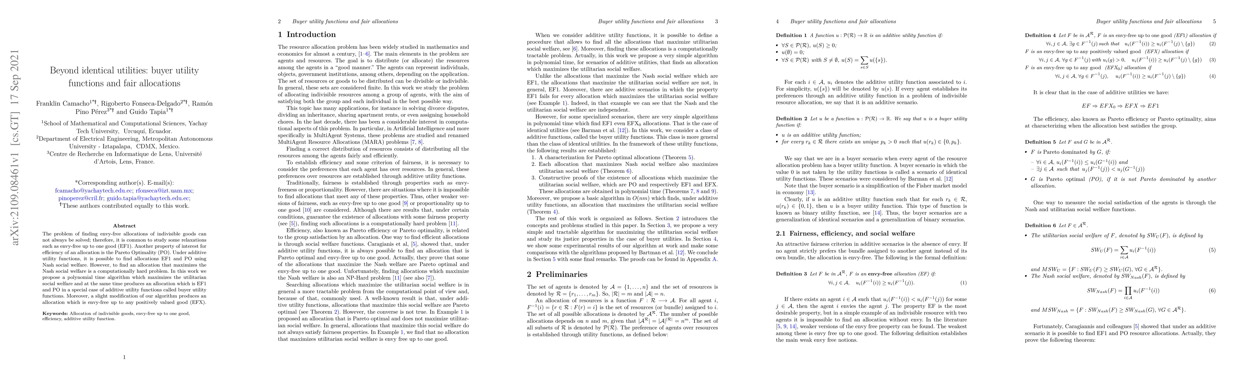 The problem of finding envy-free allocations of indivisible goods can not always be solved; therefore, it is common to study some relaxations such as envy-free up to one good (EF1). Another property of interest for efficiency of an allocation is the Pareto Optimality (PO). Under additive utility functions, it is possible to find allocations EF1 and PO using Nash social welfare. However, to find an allocation that maximizes the Nash social welfare is a computationally hard problem. In this work we propose a polynomial time algorithm which maximizes the utilitarian social welfare and at the same time produces an allocation which is EF1 and PO in a special case of additive utility functions called buyer utility functions. Moreover, a slight modification of our algorithm produces an allocation which is envy-free up to any positively valued good (EFX).