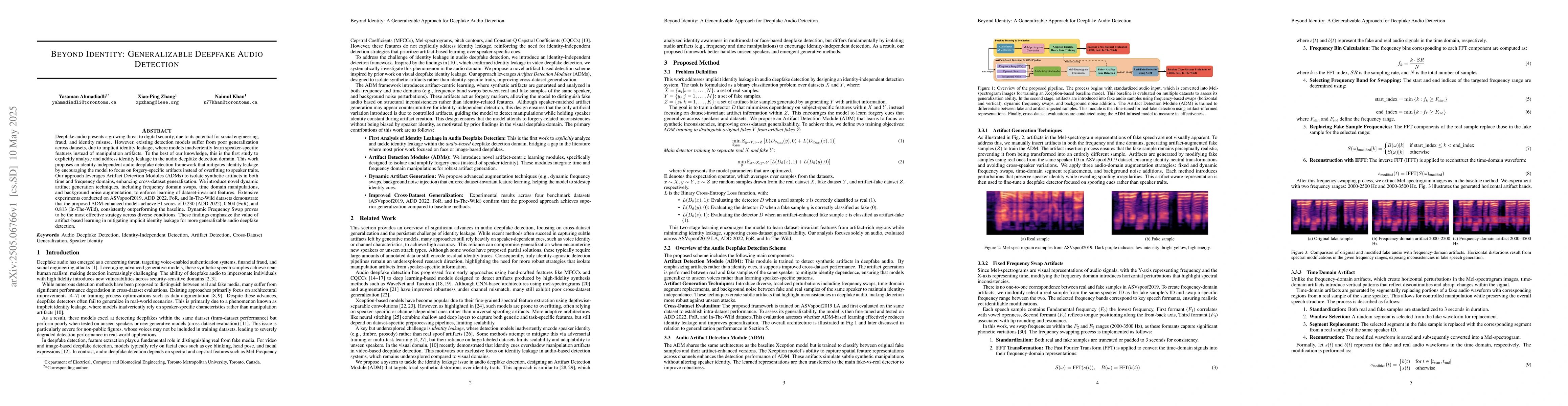Deepfake audio presents a growing threat to digital security, due to its potential for social engineering, fraud, and identity misuse. However, existing detection models suffer from poor generalization across datasets, due to implicit identity leakage, where models inadvertently learn speaker-specific features instead of manipulation artifacts. To the best of our knowledge, this is the first study to explicitly analyze and address identity leakage in the audio deepfake detection domain. This work proposes an identity-independent audio deepfake detection framework that mitigates identity leakage by encouraging the model to focus on forgery-specific artifacts instead of overfitting to speaker traits. Our approach leverages Artifact Detection Modules (ADMs) to isolate synthetic artifacts in both time and frequency domains, enhancing cross-dataset generalization. We introduce novel dynamic artifact generation techniques, including frequency domain swaps, time domain manipulations, and background noise augmentation, to enforce learning of dataset-invariant features. Extensive experiments conducted on ASVspoof2019, ADD 2022, FoR, and In-The-Wild datasets demonstrate that the proposed ADM-enhanced models achieve F1 scores of 0.230 (ADD 2022), 0.604 (FoR), and 0.813 (In-The-Wild), consistently outperforming the baseline. Dynamic Frequency Swap proves to be the most effective strategy across diverse conditions. These findings emphasize the value of artifact-based learning in mitigating implicit identity leakage for more generalizable audio deepfake detection.