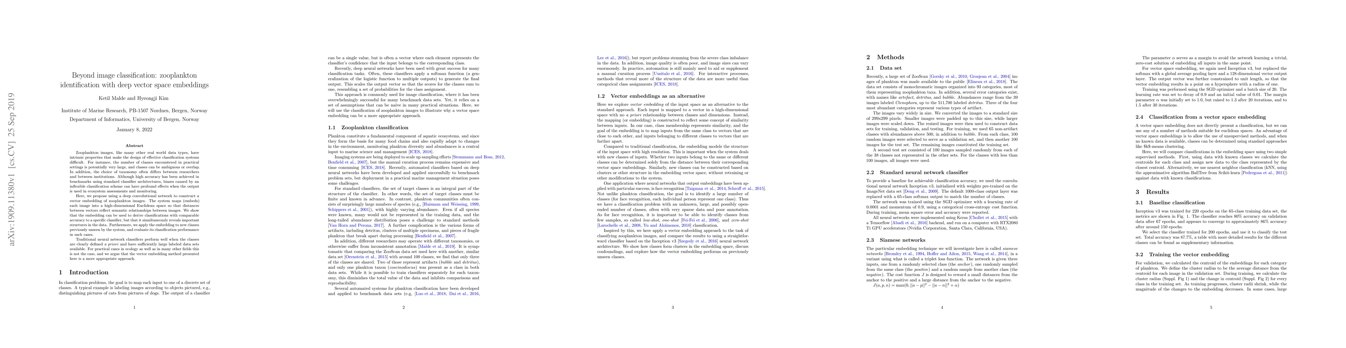 This research introduces a deep learning method using convolutional networks to create a vector embedding of zooplankton images, capturing semantic relationships and outperforming traditional classifiers in handling ambiguous, overlapping classes common in ecological data. The method shows promise in practical applications where class definitions are unclear and labeled datasets are limited.