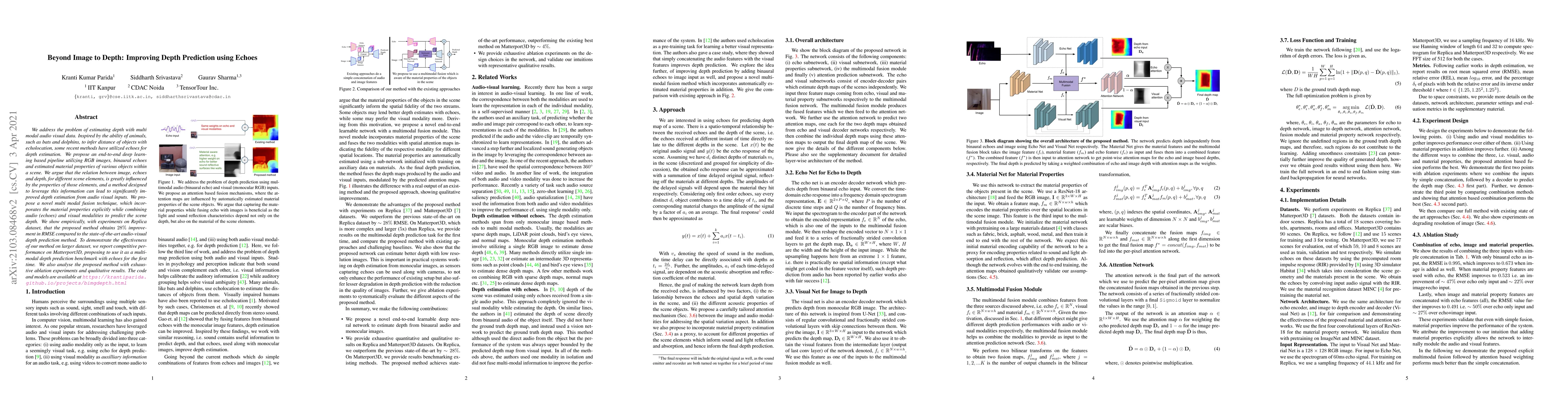 We address the problem of estimating depth with multi modal audio visual data. Inspired by the ability of animals, such as bats and dolphins, to infer distance of objects with echolocation, some recent methods have utilized echoes for depth estimation. We propose an end-to-end deep learning based pipeline utilizing RGB images, binaural echoes and estimated material properties of various objects within a scene. We argue that the relation between image, echoes and depth, for different scene elements, is greatly influenced by the properties of those elements, and a method designed to leverage this information can lead to significantly improved depth estimation from audio visual inputs. We propose a novel multi modal fusion technique, which incorporates the material properties explicitly while combining audio (echoes) and visual modalities to predict the scene depth. We show empirically, with experiments on Replica dataset, that the proposed method obtains 28% improvement in RMSE compared to the state-of-the-art audio-visual depth prediction method. To demonstrate the effectiveness of our method on larger dataset, we report competitive performance on Matterport3D, proposing to use it as a multimodal depth prediction benchmark with echoes for the first time. We also analyse the proposed method with exhaustive ablation experiments and qualitative results. The code and models are available at https://krantiparida.github.io/projects/bimgdepth.html