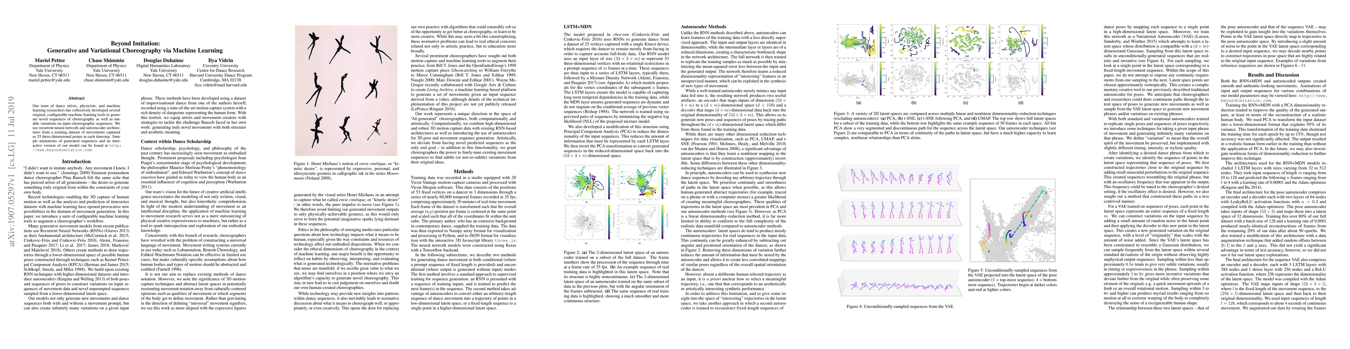 Our team of dance artists, physicists, and machine learning researchers has collectively developed several original, configurable machine-learning tools to generate novel sequences of choreography as well as tunable variations on input choreographic sequences. We use recurrent neural network and autoencoder architectures from a training dataset of movements captured as 53 three-dimensional points at each timestep. Sample animations of generated sequences and an interactive version of our model can be found at http: //www.beyondimitation.com.