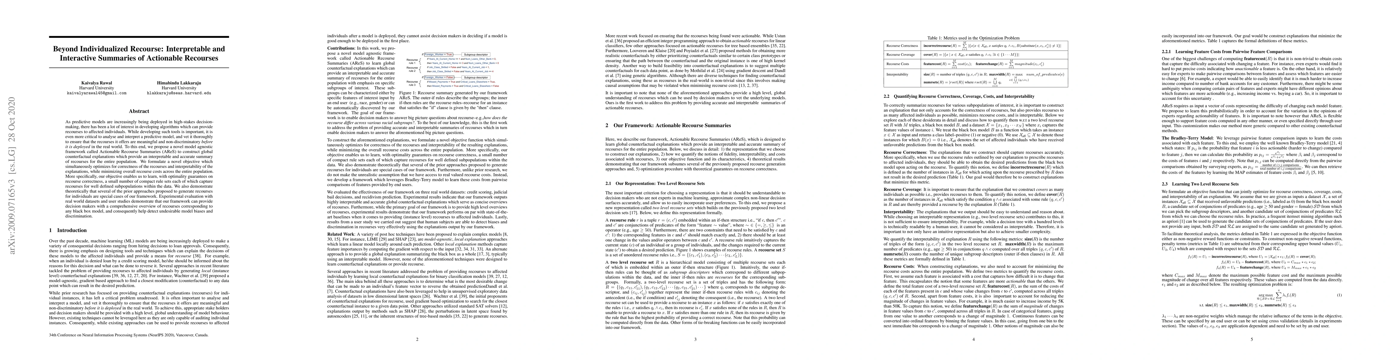 This paper proposes a novel framework called Actionable Recourse Summaries (AReS) to provide interpretable and interactive global counterfactual explanations for entire populations, optimizing for both recourse correctness and interpretability. The framework helps detect model biases and discrimination, offering decision makers a comprehensive overview of recourses for any black box model.