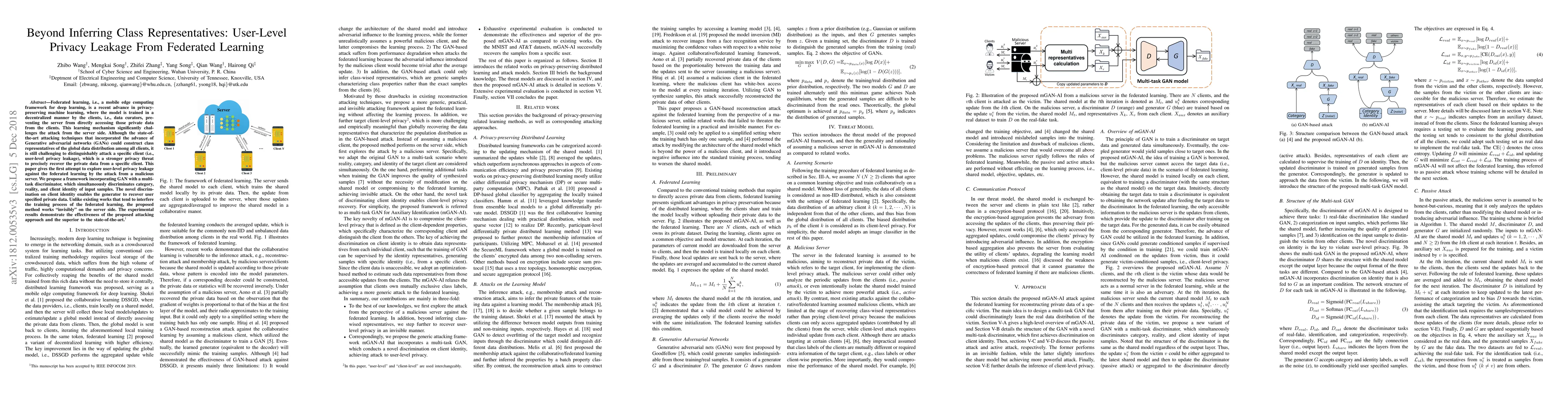 Federated learning, i.e., a mobile edge computing framework for deep learning, is a recent advance in privacy-preserving machine learning, where the model is trained in a decentralized manner by the clients, i.e., data curators, preventing the server from directly accessing those private data from the clients. This learning mechanism significantly challenges the attack from the server side. Although the state-of-the-art attacking techniques that incorporated the advance of Generative adversarial networks (GANs) could construct class representatives of the global data distribution among all clients, it is still challenging to distinguishably attack a specific client (i.e., user-level privacy leakage), which is a stronger privacy threat to precisely recover the private data from a specific client. This paper gives the first attempt to explore user-level privacy leakage against the federated learning by the attack from a malicious server. We propose a framework incorporating GAN with a multi-task discriminator, which simultaneously discriminates category, reality, and client identity of input samples. The novel discrimination on client identity enables the generator to recover user specified private data. Unlike existing works that tend to interfere the training process of the federated learning, the proposed method works "invisibly" on the server side. The experimental results demonstrate the effectiveness of the proposed attacking approach and the superior to the state-of-the-art.