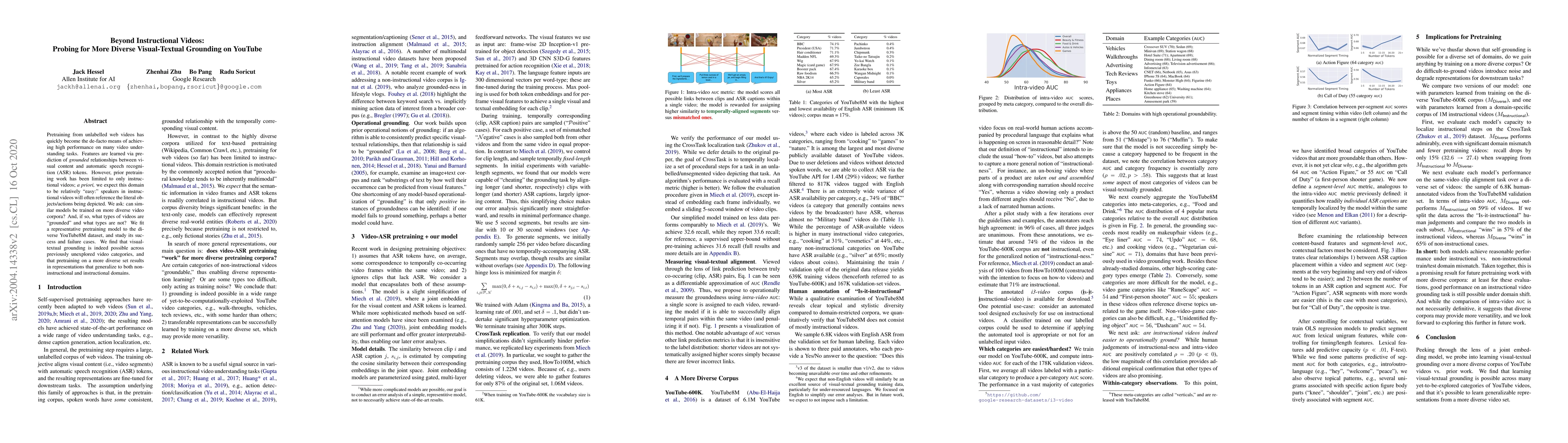 Pretraining from unlabelled web videos has quickly become the de-facto means of achieving high performance on many video understanding tasks. Features are learned via prediction of grounded relationships between visual content and automatic speech recognition (ASR) tokens. However, prior pretraining work has been limited to only instructional videos; a priori, we expect this domain to be relatively "easy:" speakers in instructional videos will often reference the literal objects/actions being depicted. We ask: can similar models be trained on more diverse video corpora? And, if so, what types of videos are "grounded" and what types are not? We fit a representative pretraining model to the diverse YouTube8M dataset, and study its success and failure cases. We find that visual-textual grounding is indeed possible across previously unexplored video categories, and that pretraining on a more diverse set results in representations that generalize to both non-instructional and instructional domains.