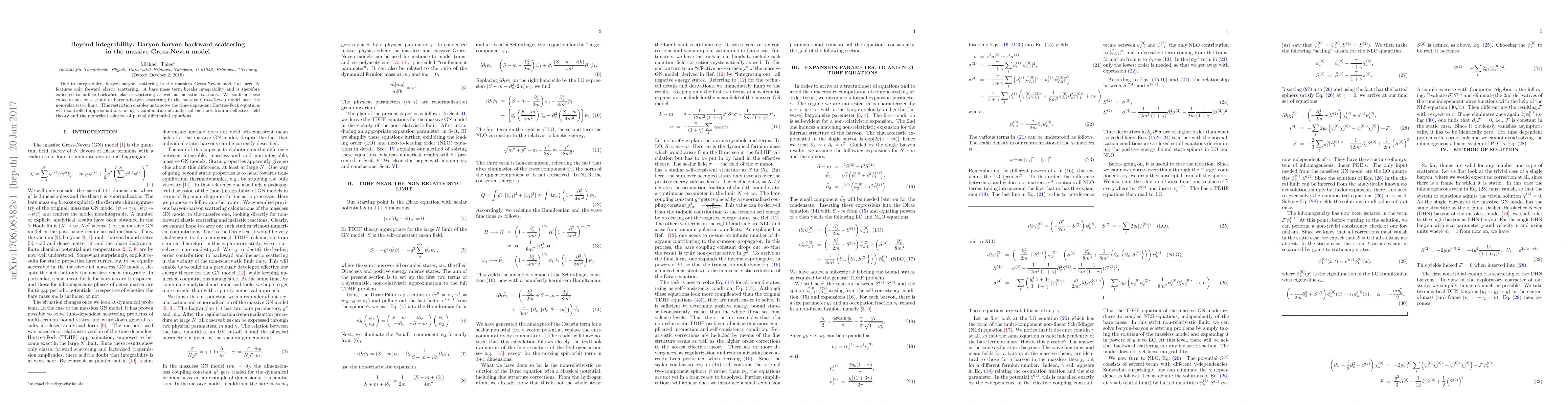 This paper investigates baryon-baryon scattering in the massive Gross-Neveu model, demonstrating that the introduction of a bare mass term breaks integrability, leading to both backward scattering and inelastic reactions. Analytical and numerical methods are employed to solve the time-dependent Hartree-Fock equations in the non-relativistic limit.