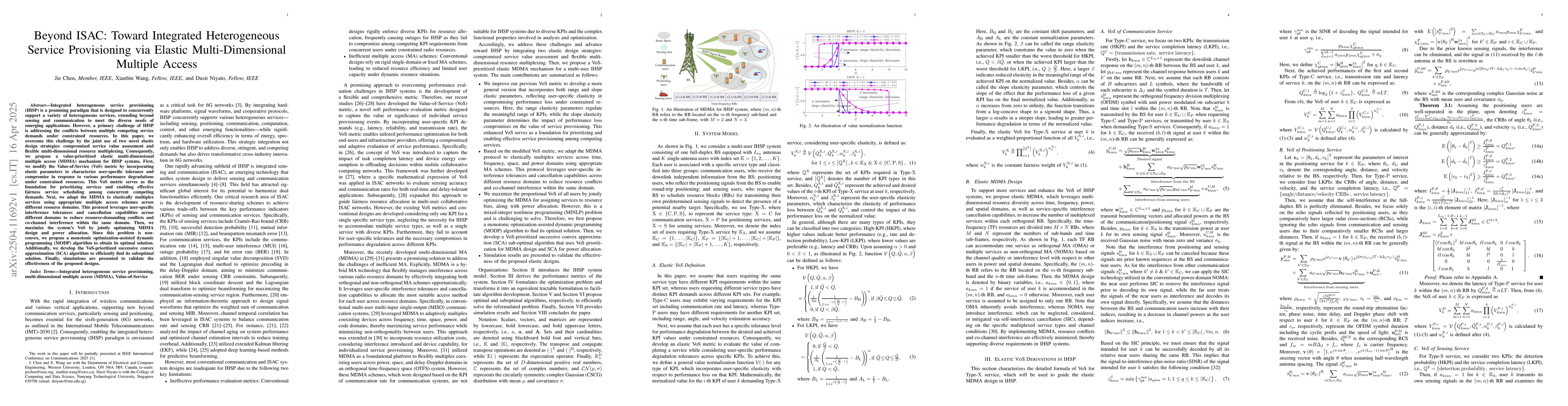The paper proposes a value-prioritized elastic multi-dimensional multiple access (MDMA) mechanism for integrated heterogeneous service provisioning (IHSP) systems, utilizing compromised service value assessment and flexible multi-dimensional resource multiplexing. It modifies the Value-of-Service (VoS) metric with elastic parameters and introduces a monotonic optimization-assisted dynamic programming (MODP) algorithm along with a VoS-prioritized successive convex approximation (SCA) algorithm for optimization.