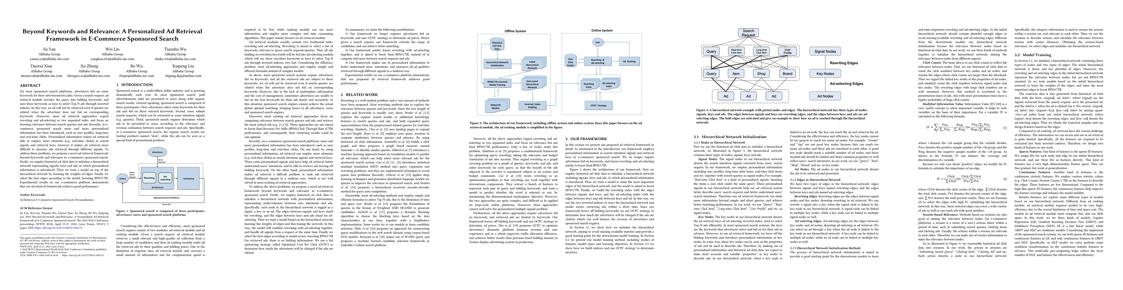 The paper proposes a personalized ad retrieval framework for e-commerce sponsored search that moves beyond traditional keyword-based retrieval. It leverages historical ad click data to create a hierarchical network integrating personalized information, trains a model to learn edge weights, and selects optimal edges to improve ad performance metrics, showing positive experimental results.