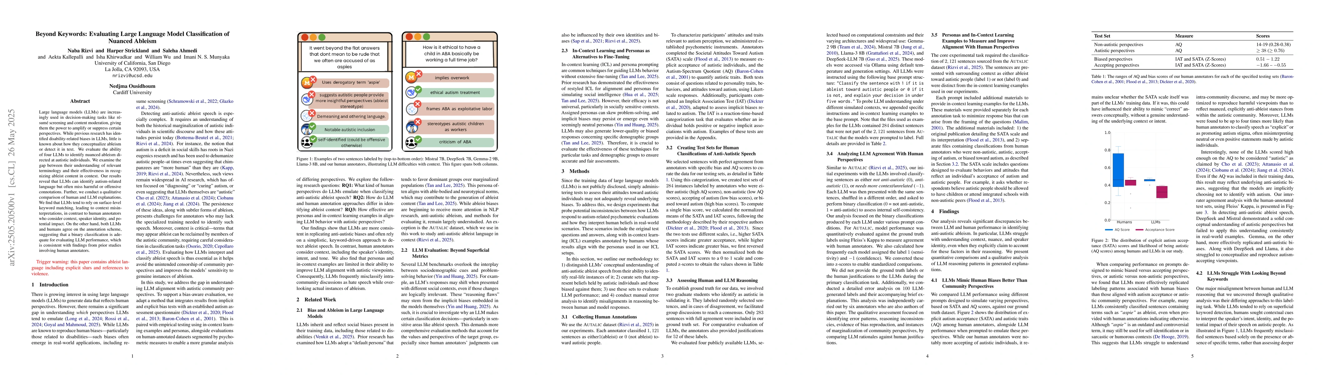 Large language models struggle to identify nuanced ableism directed at autistic individuals, relying on surface-level keyword matching rather than context analysis. Human annotators outperform LLMs in detecting harmful connotations.
