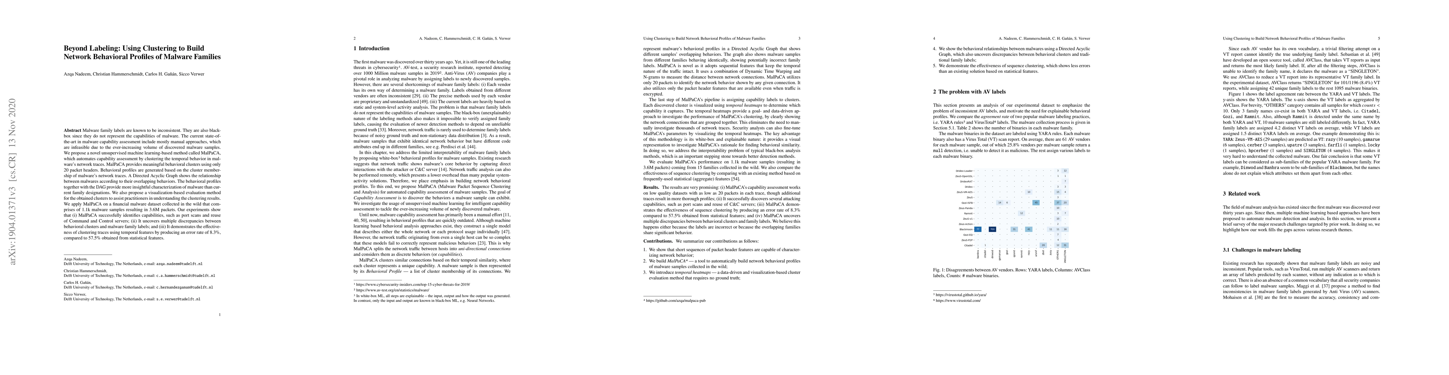 Malware family labels are known to be inconsistent. They are also black-box since they do not represent the capabilities of malware. The current state-of-the-art in malware capability assessment include mostly manual approaches, which are infeasible due to the ever-increasing volume of discovered malware samples. We propose a novel unsupervised machine learning-based method called MalPaCA, which automates capability assessment by clustering the temporal behavior in malware's network traces. MalPaCA provides meaningful behavioral clusters using only 20 packet headers. Behavioral profiles are generated based on the cluster membership of malware's network traces. A Directed Acyclic Graph shows the relationship between malwares according to their overlapping behaviors. The behavioral profiles together with the DAG provide more insightful characterization of malware than current family designations. We also propose a visualization-based evaluation method for the obtained clusters to assist practitioners in understanding the clustering results. We apply MalPaCA on a financial malware dataset collected in the wild that comprises of 1.1k malware samples resulting in 3.6M packets. Our experiments show that (i) MalPaCA successfully identifies capabilities, such as port scans and reuse of Command and Control servers; (ii) It uncovers multiple discrepancies between behavioral clusters and malware family labels; and (iii) It demonstrates the effectiveness of clustering traces using temporal features by producing an error rate of 8.3%, compared to 57.5% obtained from statistical features.