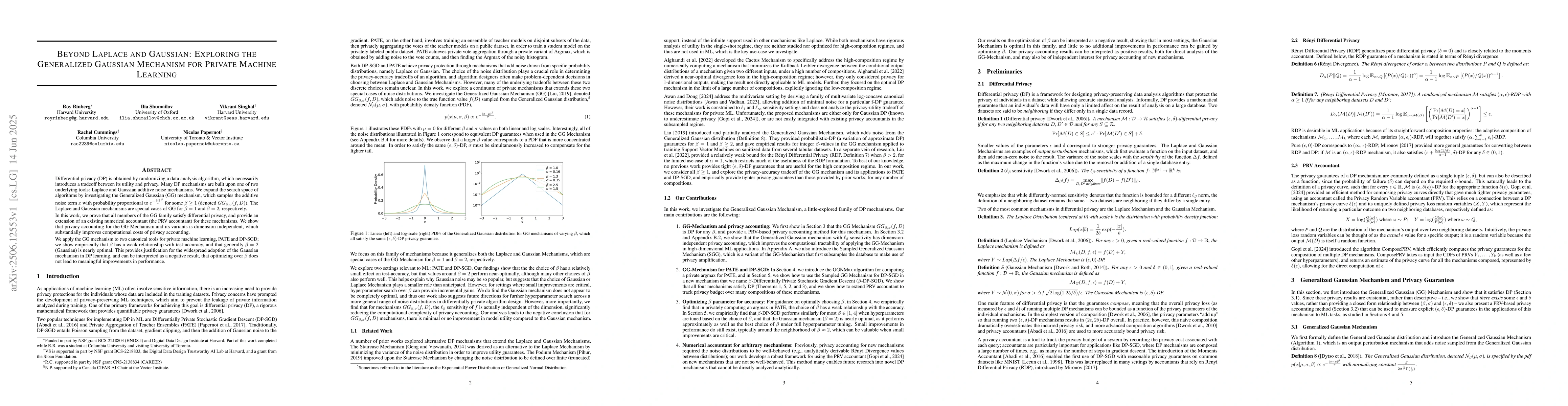 This research introduces the Generalized Gaussian (GG) mechanism for differential privacy in machine learning, extending the Laplace and Gaussian mechanisms. It proves all GG family members satisfy DP, provides a dimension-independent privacy accounting, and demonstrates that for PATE and DP-SGD, Gaussian (β=2) often performs optimally, suggesting little benefit in optimizing β for better performance.