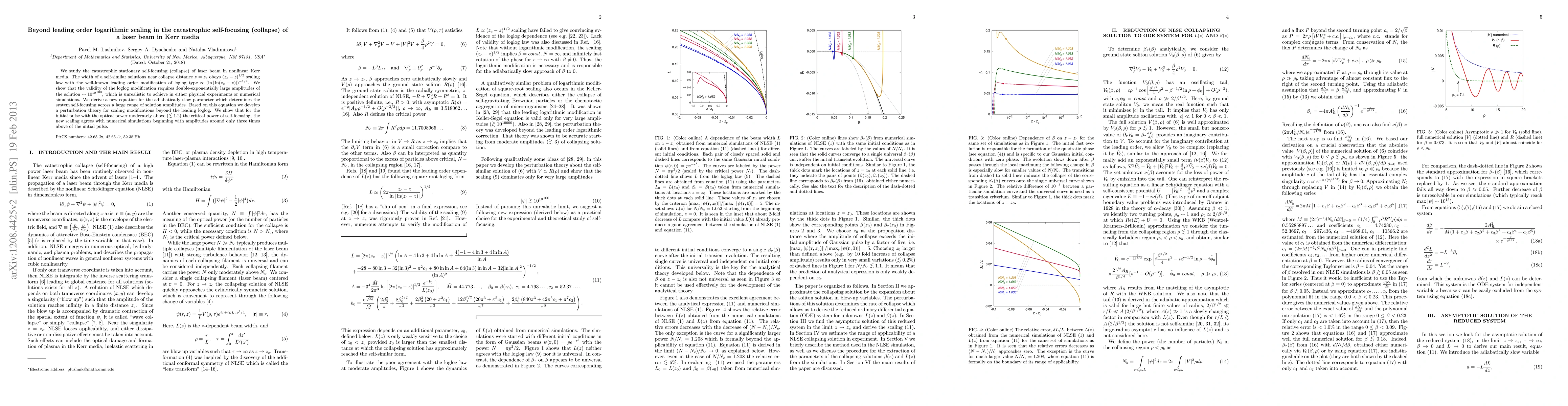 This paper explores the self-focusing collapse of a laser beam in Kerr media, revealing that the traditional loglog scaling modification requires impractically large amplitudes. It introduces a new equation for the adiabatically slow parameter and develops a perturbation theory for scaling modifications beyond the leading loglog, showing agreement with simulations for moderately higher optical power.
