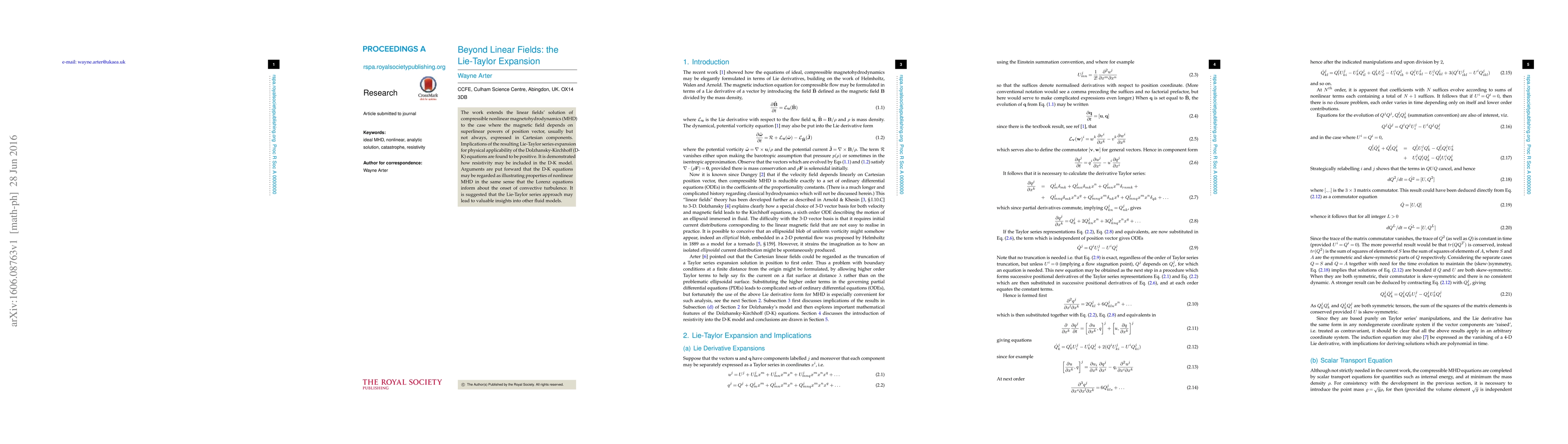 The work extends the linear fields' solution of compressible nonlinear magnetohydrodynamics~(MHD) to the case where the magnetic field depends on superlinear powers of position vector, usually but not always, expressed in Cartesian components. Implications of the resulting Lie-Taylor series expansion for physical applicability of the Dolzhansky-Kirchhoff~(D-K) equations are found to be positive. It is demonstrated how resistivity may be included in the D-K model. Arguments are put forward that the D-K equations may be regarded as illustrating properties of nonlinear MHD in the same sense that the Lorenz equations inform about the onset of convective turbulence. It is suggested that the Lie-Taylor series approach may lead to valuable insights into other fluid models.