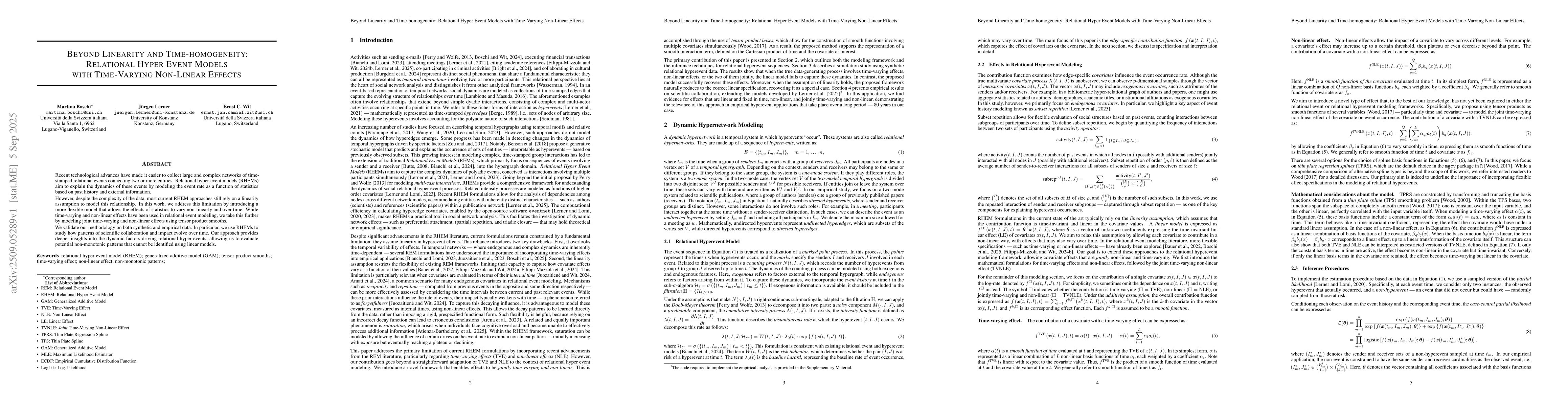 Recent technological advances have made it easier to collect large and complex networks of time-stamped relational events connecting two or more entities. Relational hyper-event models (RHEMs) aim to explain the dynamics of these events by modeling the event rate as a function of statistics based on past history and external information. However, despite the complexity of the data, most current RHEM approaches still rely on a linearity assumption to model this relationship. In this work, we address this limitation by introducing a more flexible model that allows the effects of statistics to vary non-linearly and over time. While time-varying and non-linear effects have been used in relational event modeling, we take this further by modeling joint time-varying and non-linear effects using tensor product smooths. We validate our methodology on both synthetic and empirical data. In particular, we use RHEMs to study how patterns of scientific collaboration and impact evolve over time. Our approach provides deeper insights into the dynamic factors driving relational hyper-events, allowing us to evaluate potential non-monotonic patterns that cannot be identified using linear models.