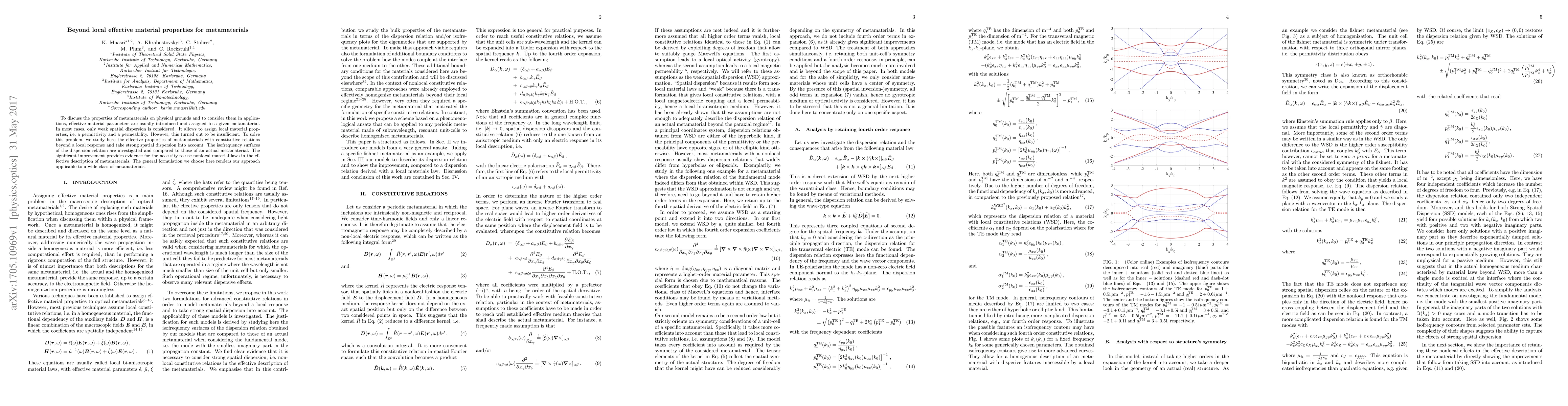 This paper investigates the effective properties of metamaterials beyond local material parameters, considering strong spatial dispersion and nonlocal constitutive relations. The study demonstrates significant improvements in describing metamaterials, highlighting the necessity of nonlocal material laws for accurate effective descriptions.