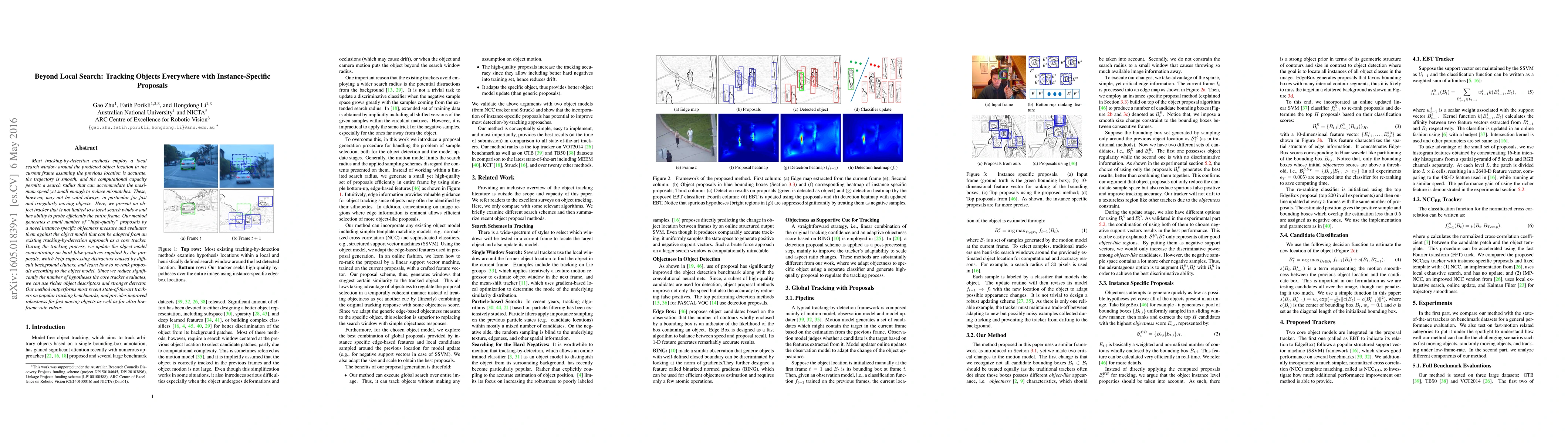 Most tracking-by-detection methods employ a local search window around the predicted object location in the current frame assuming the previous location is accurate, the trajectory is smooth, and the computational capacity permits a search radius that can accommodate the maximum speed yet small enough to reduce mismatches. These, however, may not be valid always, in particular for fast and irregularly moving objects. Here, we present an object tracker that is not limited to a local search window and has ability to probe efficiently the entire frame. Our method generates a small number of "high-quality" proposals by a novel instance-specific objectness measure and evaluates them against the object model that can be adopted from an existing tracking-by-detection approach as a core tracker. During the tracking process, we update the object model concentrating on hard false-positives supplied by the proposals, which help suppressing distractors caused by difficult background clutters, and learn how to re-rank proposals according to the object model. Since we reduce significantly the number of hypotheses the core tracker evaluates, we can use richer object descriptors and stronger detector. Our method outperforms most recent state-of-the-art trackers on popular tracking benchmarks, and provides improved robustness for fast moving objects as well as for ultra low-frame-rate videos.