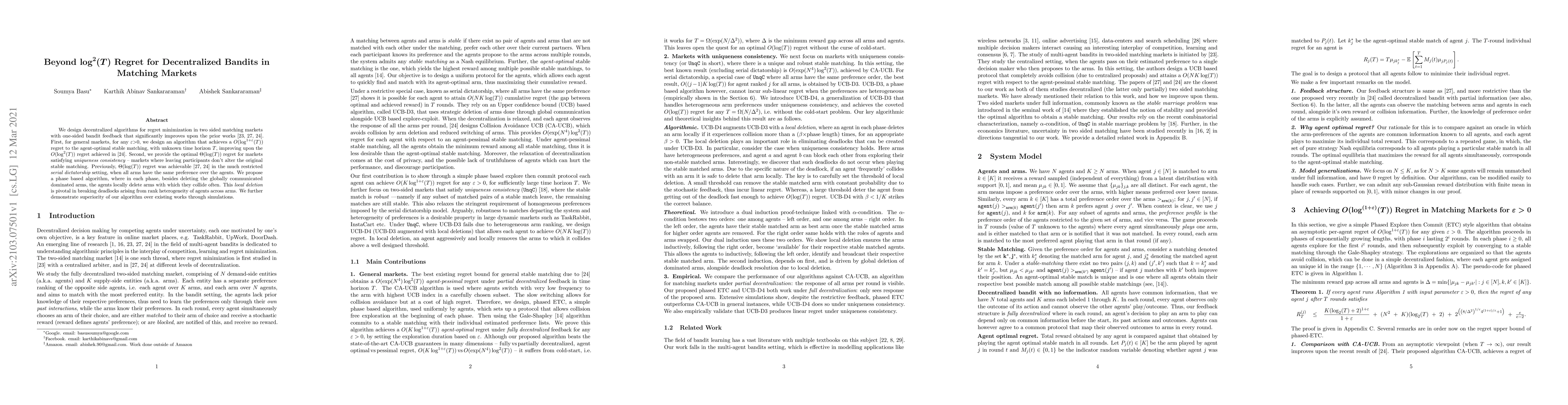 Researchers have developed a decentralized algorithm to minimize regret in matching markets with one-sided bandit feedback, achieving $O( ext{log}^{1+ ext{ε}}(T))$ regret for general markets and $ ext{ΰ}( ext{log}(T))$ regret for unique consistency markets.