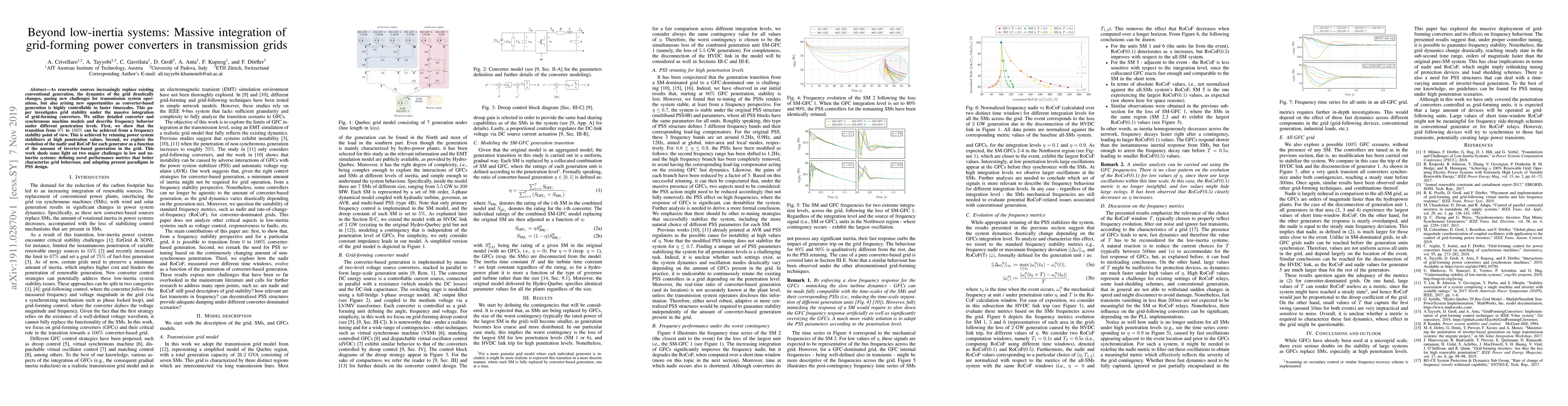 Researchers studied grid stability with massive integration of grid-forming converters in transmission grids, finding that high penetration levels can achieve 100% transition from conventional generation to converter-based generation without compromising frequency stability. The study also highlights the need for new performance metrics and adapted paradigms in power system stabilizer design for low-inertia systems.