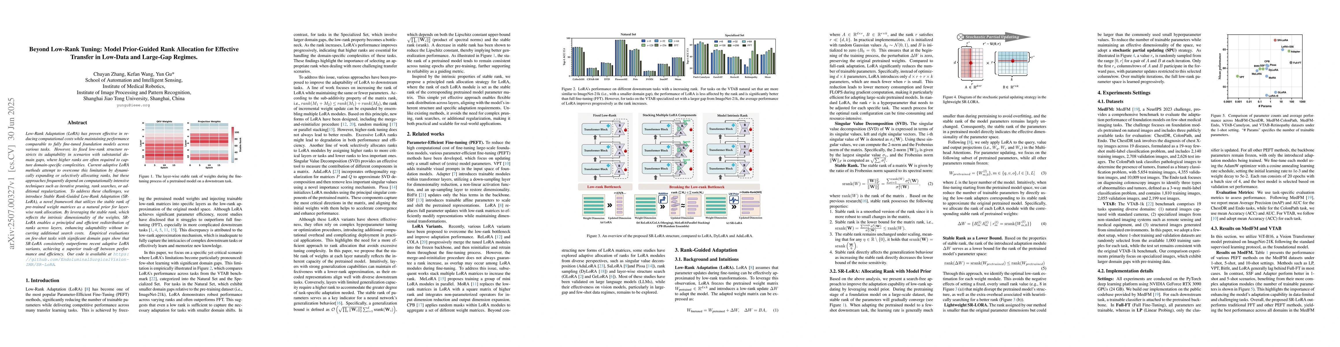 Low-Rank Adaptation (LoRA) has proven effective in reducing computational costs while maintaining performance comparable to fully fine-tuned foundation models across various tasks. However, its fixed low-rank structure restricts its adaptability in scenarios with substantial domain gaps, where higher ranks are often required to capture domain-specific complexities. Current adaptive LoRA methods attempt to overcome this limitation by dynamically expanding or selectively allocating ranks, but these approaches frequently depend on computationally intensive techniques such as iterative pruning, rank searches, or additional regularization. To address these challenges, we introduce Stable Rank-Guided Low-Rank Adaptation (SR-LoRA), a novel framework that utilizes the stable rank of pre-trained weight matrices as a natural prior for layer-wise rank allocation. By leveraging the stable rank, which reflects the intrinsic dimensionality of the weights, SR-LoRA enables a principled and efficient redistribution of ranks across layers, enhancing adaptability without incurring additional search costs. Empirical evaluations on few-shot tasks with significant domain gaps show that SR-LoRA consistently outperforms recent adaptive LoRA variants, achieving a superior trade-off between performance and efficiency. Our code is available at https://github.com/EndoluminalSurgicalVision-IMR/SR-LoRA.