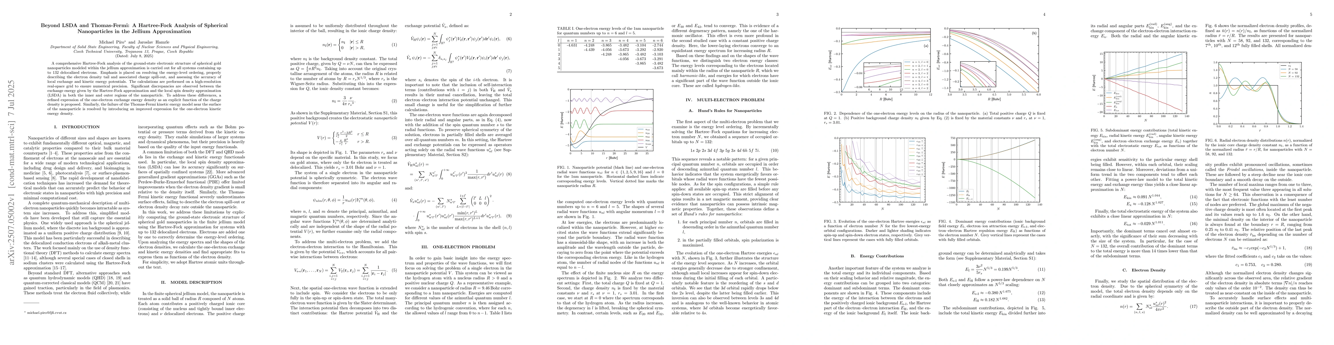 A comprehensive Hartree-Fock analysis of the ground-state electronic structure of spherical gold nanoparticles modeled within the jellium approximation is carried out for all systems containing up to 132 delocalized electrons. Emphasis is placed on resolving the energy-level ordering, properly describing the electron density tail and associated charge spill-out, and assessing the accuracy of local exchange and kinetic energy potentials. The calculations are performed on a high-resolution real-space grid to ensure numerical precision. Significant discrepancies are observed between the exchange energy given by the Hartree-Fock approximation and the local spin density approximation (LSDA) in both the inner and outer regions of the nanoparticle. To address these differences, a refined expression of the one-electron exchange energy density as an explicit function of the charge density is proposed. Similarly, the failure of the Thomas-Fermi kinetic energy model near the surface of the nanoparticle is resolved by introducing an improved expression for the one-electron kinetic energy density.