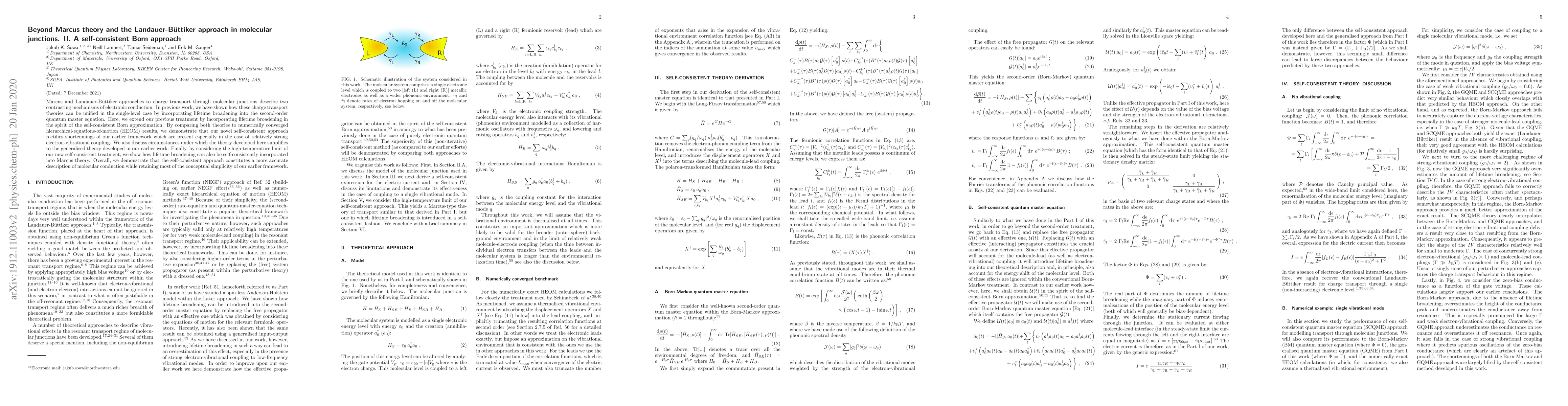 Marcus and Landauer-Buttiker approaches to charge transport through molecular junctions describe two contrasting mechanisms of electronic conduction. In previous work, we have shown how these charge transport theories can be unified in the single-level case by incorporating lifetime broadening into the second-order quantum master equation. Here, we extend our previous treatment by incorporating lifetime broadening in the spirit of the self-consistent Born approximation. By comparing both theories to numerically converged hierarchical-equations-of-motion (HEOM) results, we demonstrate that our novel self-consistent approach rectifies shortcomings of our earlier framework which are present especially in the case of relatively strong electron-vibrational coupling. We also discuss circumstances under which the theory developed here simplifies to the generalised theory developed in our earlier work. Finally, by considering the high-temperature limit of our new self-consistent treatment, we show how lifetime broadening can also be self-consistently incorporated into Marcus theory. Overall, we demonstrate that the self-consistent approach constitutes a more accurate description of molecular conduction while retaining most of the conceptual simplicity of our earlier framework.