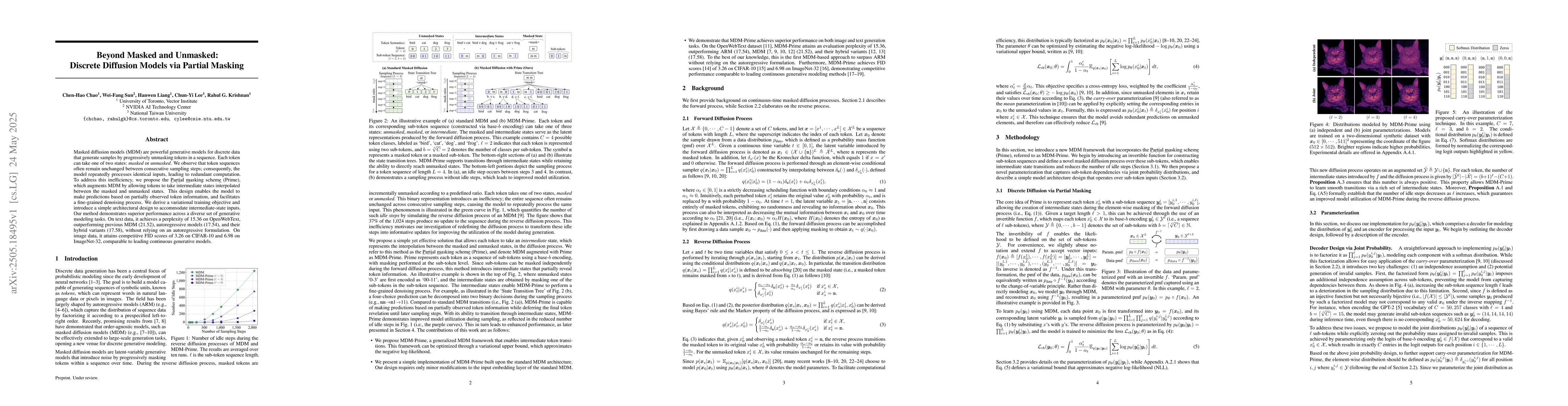 The research proposes Partial Masking (Prime), a scheme for discrete diffusion models that introduces intermediate states between 'masked' and 'unmasked' token conditions, enabling fine-grained denoising and reducing redundant computation in masked diffusion models (MDM).