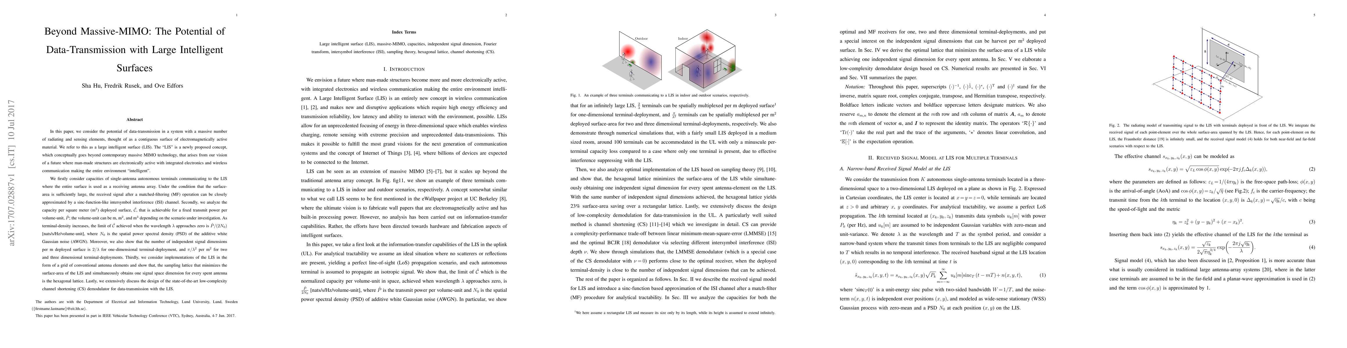 In this paper, we consider the potential of data-transmission in a system with a massive number of radiating and sensing elements, thought of as a contiguous surface of electromagnetically active material. We refer to this as a large intelligent surface (LIS). The "LIS" is a newly proposed concept, which conceptually goes beyond contemporary massive MIMO technology, that arises from our vision of a future where man-made structures are electronically active with integrated electronics and wireless communication making the entire environment "intelligent". We consider capacities of single-antenna autonomous terminals communicating to the LIS where the entire surface is used as a receiving antenna array. Under the condition that the surface-area is sufficiently large, the received signal after a matched-filtering (MF) operation can be closely approximated by a sinc-function-like intersymbol interference (ISI) channel. We analyze the capacity per square meter (m^2) deployed surface, \hat{C}, that is achievable for a fixed transmit power per volume-unit, \hat{P}. Moreover, we also show that the number of independent signal dimensions per m deployed surface is 2/\lambda for one-dimensional terminal-deployment, and \pi/\lambda^2 per m^2 for two and three dimensional terminal-deployments. Lastly, we consider implementations of the LIS in the form of a grid of conventional antenna elements and show that, the sampling lattice that minimizes the surface-area of the LIS and simultaneously obtains one signal space dimension for every spent antenna is the hexagonal lattice. We extensively discuss the design of the state-of-the-art low-complexity channel shortening (CS) demodulator for data-transmission with the LIS.