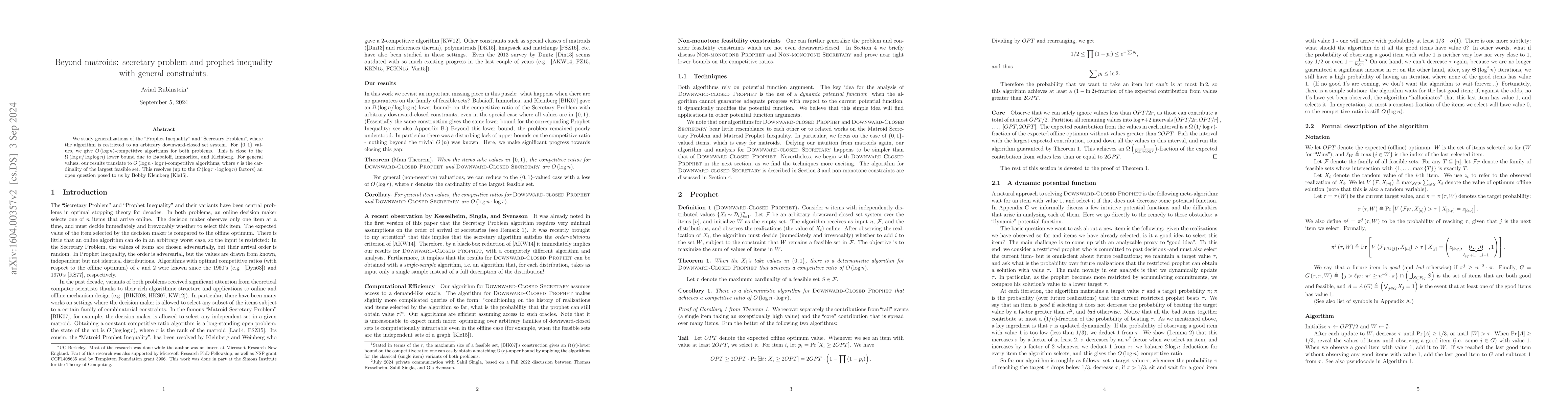 The paper presents efficient algorithms for the Secretary Problem and Prophet Inequality with general constraints, achieving O(log n)-competitive solutions for binary values and O(log n log r)-competitive solutions for general values.