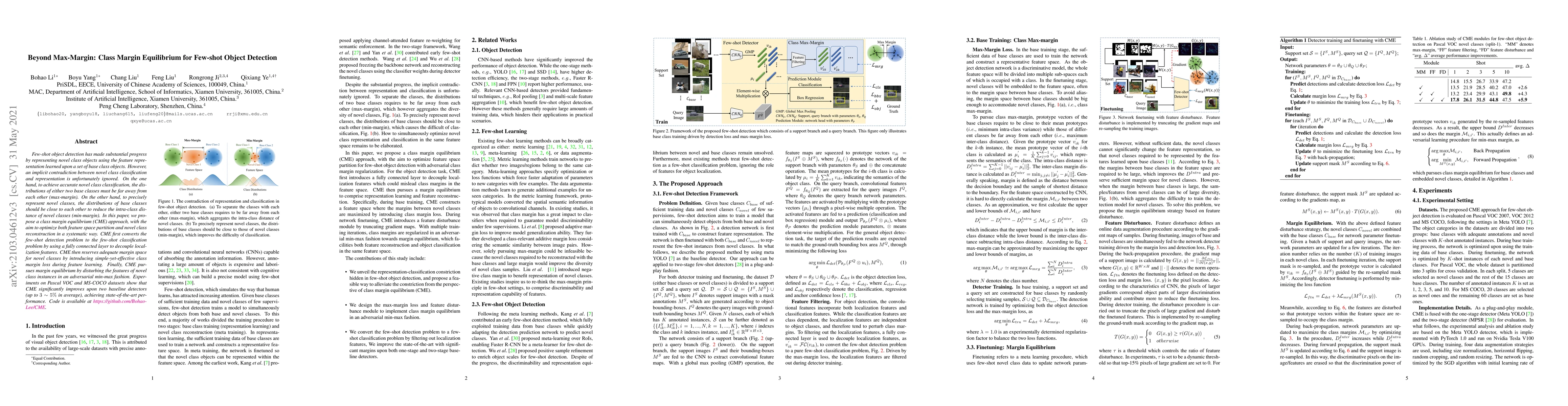 This paper proposes a Class Margin Equilibrium (CME) approach to address the contradiction in few-shot object detection between maximizing the margin for classification accuracy and minimizing the margin for precise novel class representation. CME optimizes both feature space partition and novel class reconstruction, achieving state-of-the-art performance on Pascal VOC and MS-COCO datasets.