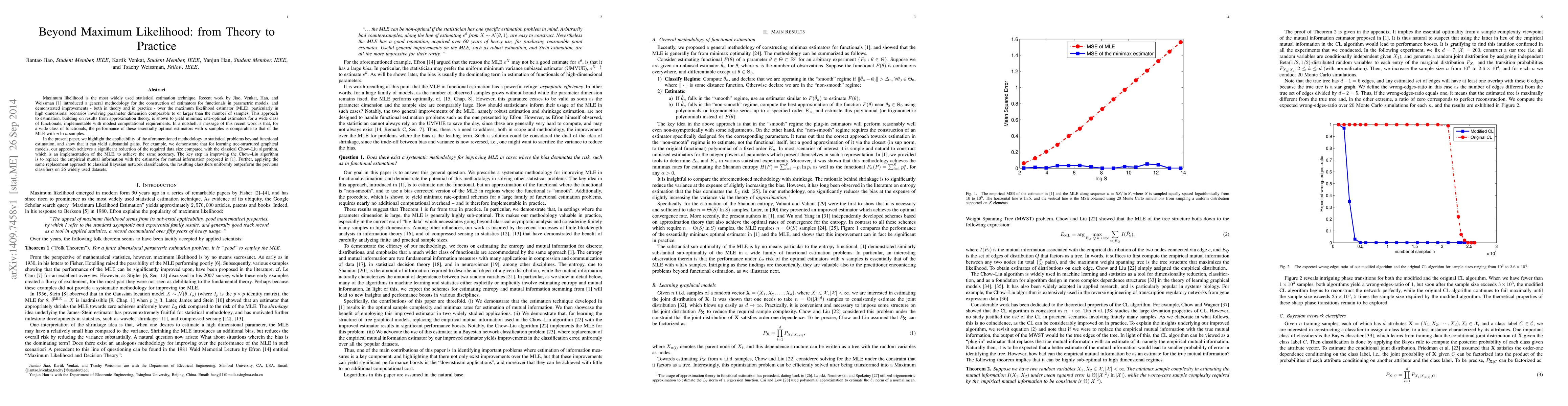 Maximum likelihood is the most widely used statistical estimation technique. Recent work by the authors introduced a general methodology for the construction of estimators for functionals in parametric models, and demonstrated improvements - both in theory and in practice - over the maximum likelihood estimator (MLE), particularly in high dimensional scenarios involving parameter dimension comparable to or larger than the number of samples. This approach to estimation, building on results from approximation theory, is shown to yield minimax rate-optimal estimators for a wide class of functionals, implementable with modest computational requirements. In a nutshell, a message of this recent work is that, for a wide class of functionals, the performance of these essentially optimal estimators with $n$ samples is comparable to that of the MLE with $n \ln n$ samples. In the present paper, we highlight the applicability of the aforementioned methodology to statistical problems beyond functional estimation, and show that it can yield substantial gains. For example, we demonstrate that for learning tree-structured graphical models, our approach achieves a significant reduction of the required data size compared with the classical Chow--Liu algorithm, which is an implementation of the MLE, to achieve the same accuracy. The key step in improving the Chow--Liu algorithm is to replace the empirical mutual information with the estimator for mutual information proposed by the authors. Further, applying the same replacement approach to classical Bayesian network classification, the resulting classifiers uniformly outperform the previous classifiers on 26 widely used datasets.