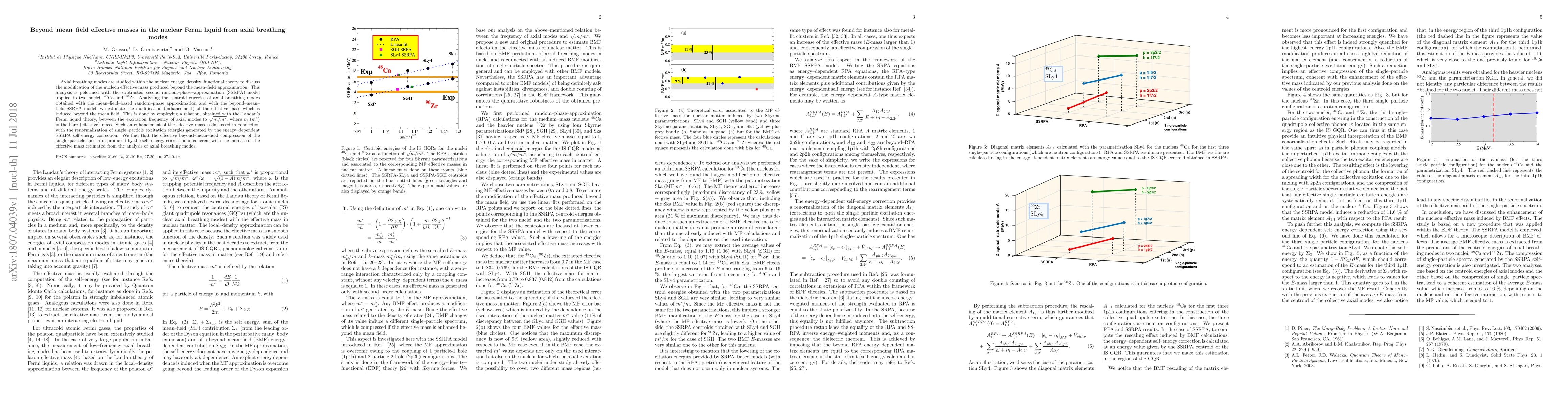 Axial breathing modes are studied within the nuclear energy--density--functional theory to discuss the modification of the nucleon effective mass produced beyond the mean--field approximation. This analysis is peformed with the subtracted second random--phase--approximation (SSRPA) model applied to two nuclei, $^{48}$Ca and $^{90}$Zr. Analyzing the centroid energies of axial breathing modes obtained with the mean--field--based random--phase approximation and with the beyond--mean--field SSRPA model, we estimate the modification (enhancement) of the effective mass which is induced beyond the mean field. This is done by employing a relation, obtained with the Landau's Fermi liquid theory, between the excitation frequency of axial modes to $\sqrt{m/m^*}$, where $m$ ($m^*$) is the bare (effective) mass. Such an enhancement of the effective mass is discussed in connection with the renormalization of single--particle excitation energies generated by the energy--dependent SSRPA self-energy correction. We find that the effective beyond--mean--field compression of the single--particle spectrum produced by the self--energy correction is coherent with the increase of the effective mass estimated from the analysis of axial breathing modes.