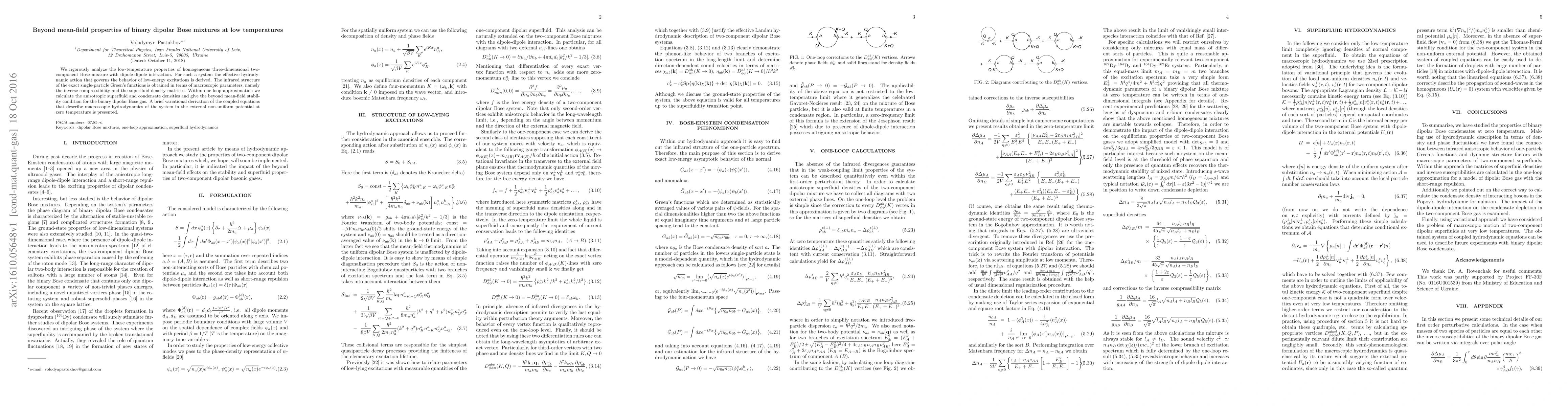 We rigorously analyze the low-temperature properties of homogeneous three-dimensional two-component Bose mixture with dipole-dipole interaction. For such a system the effective hydrodynamic action that governs the behavior of low-energy excitations is derived. The infrared structure of the exact single-particle Green's functions is obtained in terms of macroscopic parameters, namely the inverse compressibility and the superfluid density matrices. Within one-loop approximation we calculate the anisotropic superfluid and condensate densities and give the beyond mean-field stability condition for the binary dipolar Bose gas. A brief variational derivation of the coupled equations that describe macroscopic hydrodynamics of the system in the external non-uniform potential at zero temperature is presented.