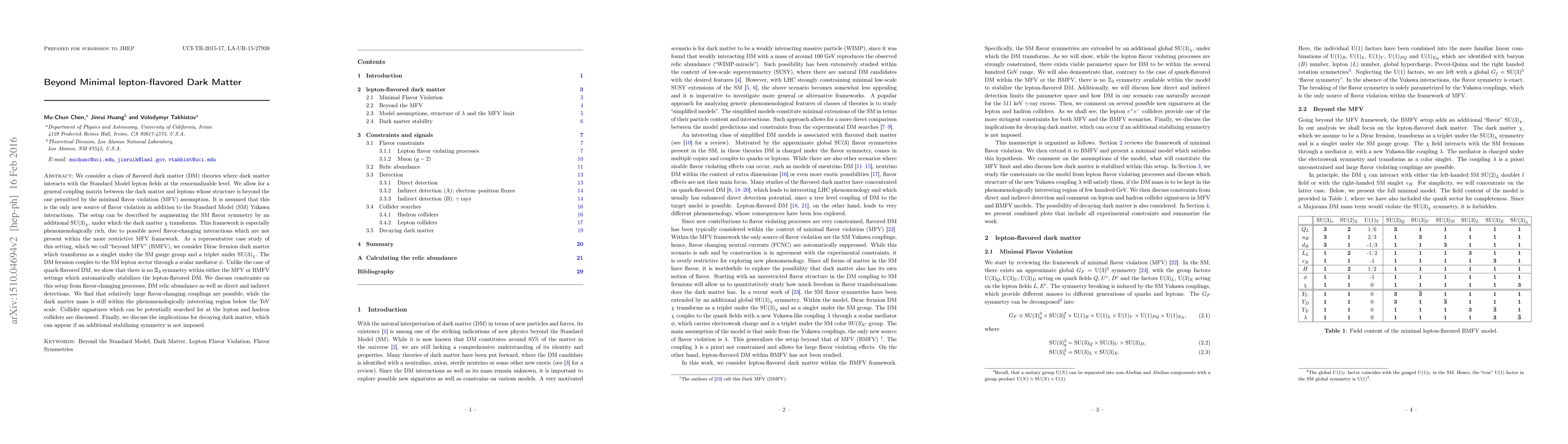 We consider a class of flavored dark matter (DM) theories where dark matter interacts with the Standard Model lepton fields at the renormalizable level. We allow for a general coupling matrix between the dark matter and leptons whose structure is beyond the one permitted by the minimal flavor violation (MFV) assumption. It is assumed that this is the only new source of flavor violation in addition to the Standard Model (SM) Yukawa interactions. The setup can be described by augmenting the SM flavor symmetry by an additional $\mathrm{SU}(3)_{\chi}$, under which the dark matter $\chi$ transforms. This framework is especially phenomenologically rich, due to possible novel flavor-changing interactions which are not present within the more restrictive MFV framework. As a representative case study of this setting, which we call "beyond MFV" (BMFV), we consider Dirac fermion dark matter which transforms as a singlet under the SM gauge group and a triplet under $\mathrm{SU}(3)_{\chi}$. The DM fermion couples to the SM lepton sector through a scalar mediator $\phi$. Unlike the case of quark-flavored DM, we show that there is no $\mathbb{Z}_3$ symmetry within either the MFV or BMFV settings which automatically stabilizes the lepton-flavored DM. We discuss constraints on this setup from flavor-changing processes, DM relic abundance as well as direct and indirect detections. We find that relatively large flavor-changing couplings are possible, while the dark matter mass is still within the phenomenologically interesting region below the TeV scale. Collider signatures which can be potentially searched for at the lepton and hadron colliders are discussed. Finally, we discuss the implications for decaying dark matter, which can appear if an additional stabilizing symmetry is not imposed.