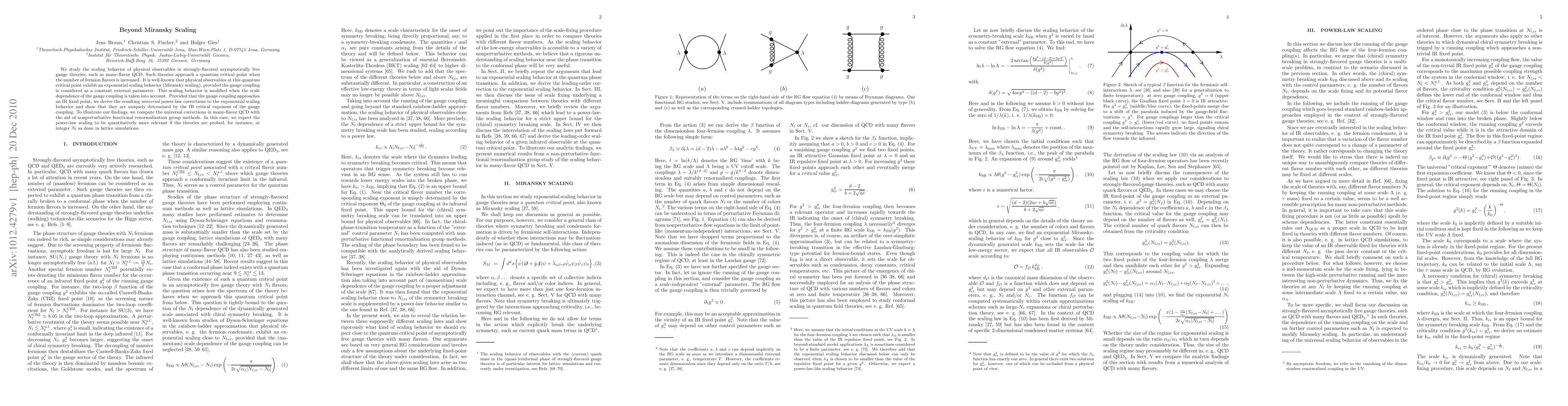 We study the scaling behavior of physical observables in strongly-flavored asymptotically free gauge theories, such as many-flavor QCD. Such theories approach a quantum critical point when the number of fermion flavors is increased. It is well-known that physical observables at this quantum critical point exhibit an exponential scaling behavior (Miransky scaling), provided the gauge coupling is considered as a constant external parameter. This scaling behavior is modified when the scale dependence of the gauge coupling is taken into account. Provided that the gauge coupling approaches an IR fixed point, we derive the resulting universal power-law corrections to the exponential scaling behavior and show that they are uniquely determined by the IR critical exponent of the gauge coupling. To illustrate our findings, we compute the universal corrections in many-flavor QCD with the aid of nonperturbative functional renormalization group methods. In this case, we expect the power-law scaling to be quantitatively more relevant if the theories are probed, for instance, at integer Nf as done in lattice simulations.