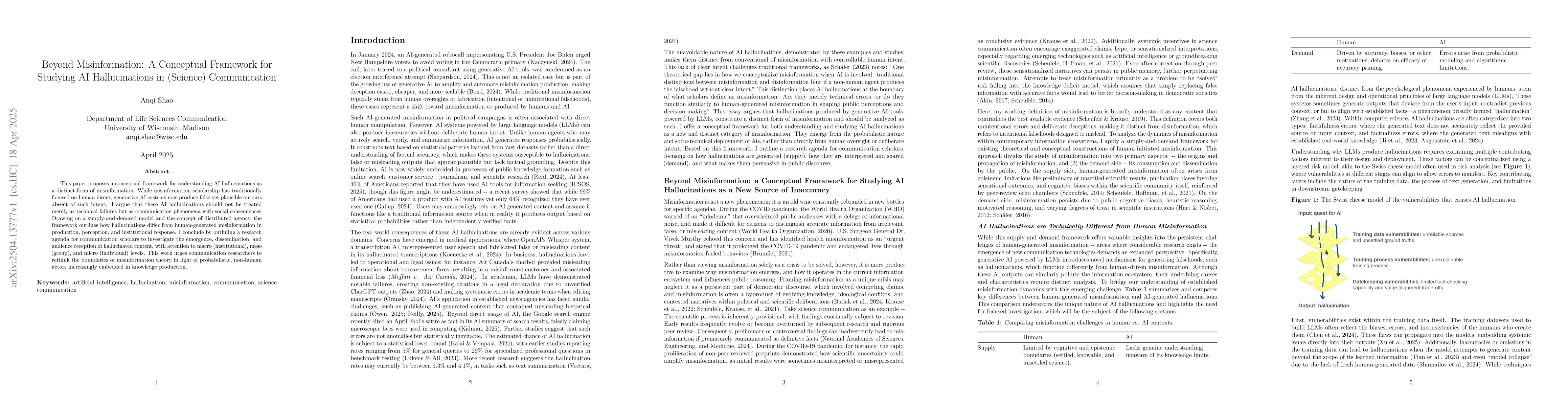 The paper proposes a conceptual framework for understanding AI hallucinations in (science) communication, distinguishing them from human-generated misinformation based on production, perception, and institutional response.